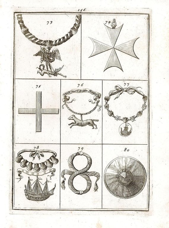 Incisione, antica ed originale, raffigurante la Collana dei Cavalieri di S. Michele in Francia formata da conchiglie concatenate con pendente la cui immagine raffigura S. Michele in atto di scacciare il Demonio, Croce del Cavaliere di Monte Gaudio, Croce del Cavaliere di Montesia, Collana del Cavaliere detto dell’Armellino, Collana del Cavaliere della Nave in Francia formata da conchiglie, Collana ed effige del Cavaliere della Nave in Napoli, nodo del Cavaliere del Nodo del Regno di Napoli, Scudo del Cavaliere dello Scudo Verde