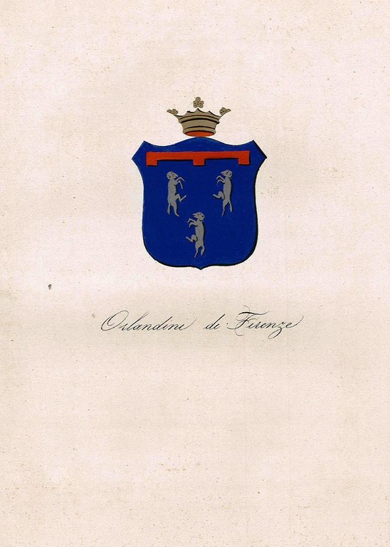 Stemma araldico della famiglia, finemente colorato a mano all'epoca con vivace acquerellatura a tempera. La stampa è accompagnata da pagine con testo storico descrittivo
