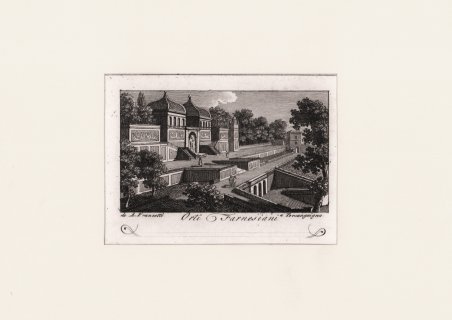 Veduta tratta dalla celebre Raccolta di num. 320 Vedute sì antiche, che moderne della città di Roma. …Incise a bulino in N. 80 rami, In Roma Nella Calcografia di Agapito Franzetti a Torsanguigna Col Permesso. ' L’opera si compone di un frontespizio calcografico e di 80 tavole numerate, ognuna composta da quattro vedute. Viene stampata senza data; molti repertori la datano intorno al 1790 circa, forse perché stampata su carta vergata. Una datazione intorno al 1800 ci sembra tuttavia più plausibile. ' Agapito Franzetti, calcografo attivo a Roma con bottega tra via del Corso e Torsanguigna, è noto per le sue piccole incisioni di veduta che servivano spesso come biglietti da visita. Tutte contengono, infatti, una linea in basso, dove si poteva apporre il proprio nome ad inchiostro. Come indicato nel titolo, le vedute raffigurano sia monumenti e antiche rovine che vedute “moderne”, con piazze, chiese e ville. Ciascuna tavola reca, in basso al centro, il nome dell’incisore. Gli artisti coinvolti sono sei: Jean-Jerome Baugean; Antonio Giuseppe Barbazza; Giovanni Battista Cipriani; Francesco Morelli; Antonio Poretta e Domenico Pronti. Molte delle vedute derivano dalla celebre opera di Giuseppe Vasi, Delle magnificenze di Roma antica e moderna. Pubblicata in 10 volumi dal 1747 al 1761, l’opera presenta 238 incisioni in rame, ciascuna incisione con testo narrativo che fornisce informazioni storiche e documentarie. ' Acquaforte, in buono stato di conservazione. ' Bibliografia: A. Bertarelli, H. Prior, Il biglietto da visita italiano. Cintributo alla storia del costume e dell'incisione nel secolo XVII, Bergamo 1911, p. 162. View of the city printed in Rome by the publisher Agapito Franzetti. Taken from Raccolta di num. 320 Vedute sì antiche, che moderne della città di Roma. …Incise a bulino in N. 80 rami, In Roma Nella Calcografia di Agapito Franzetti a Torsanguigna Col Permesso. ' The work consists of an intaglio frontispiece and 80 numbered plates, each consisting of four views. It is printed without date; many repertories date it around 1790, perhaps because it was printed on laid paper. A date around 1800 seems more plausible. Franzetti, a chalcographer working in Rome with a workshop between Via del Corso and Torsanguigna, is known for his small engravings of views that were often used as business cards. They all contain a line at the bottom where one's name could be written in ink. The small views were often printed four to a sheet. As indicated in the title, the views depict both monuments and ancient ruins and "modern" views, with squares, churches and villas. Each table bears, at the bottom center, the name of the engraver. There are six artists involved: Jean-Jerome Baugean; Antonio Giuseppe Barbazza; Giovanni Battista Cipriani; Francesco Morelli; Antonio Poretta and Domenico Pronti. ' The views are made after Giuseppe Vasi’s monumental work Delle magnificenze di Roma antica e moderna. Published in 10 volumes from 1747 to 1761, the work features 238 copper engravings, each engraving with a narrative text that provides historical and documentary information. ' Bibliografia: A. Bertarelli, H. Prior, Il biglietto da visita italiano. Contributo alla storia del costume e dell'incisione nel secolo XVII, Bergamo 1911, p. 162. Cfr.