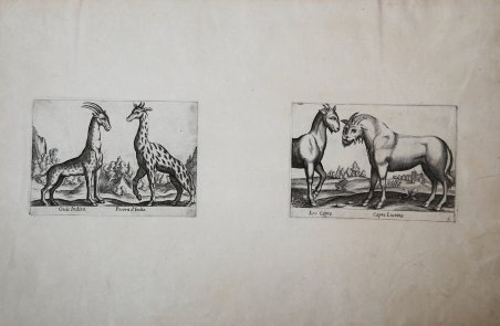 Due incisioni impresse su un foglio di carta vergata, disegnate ed incise, all'acquaforte e al bulino, da Antonio Tempesta. Le due immagini furono pubblicate nella serie ' Nuova raccolta de li Animali più curiosi del mondo […], di Antonio Tempesta, opera che conobbe numerose edizioni dopo la prima ' del ' 1620, edita ' da Giandomenico de Rossi.L'opera è un bestiario, privo di testo, che comprende in buona parte la prima e ampia iconografia zoologica, ma anche animali fantastici della tradizione mitologica, come il grifone o il satiro marino. ' Le immagini dell'opera, nella prima edizione 222, erano distribuite su 111 fogli oblunghi, con due lastre stampate per ciascun foglio. Ciascuna immagine ha una didascalia con il nome dell'animale raffigurato in latino e in italiano. ' Foglio in ottimo stato di conservazione con margini originali. ' Dimensioni della singola incisone: 137x97. ' Due incisioni impresse su un foglio di carta vergata, disegnate ed incise, all'acquaforte e al bulino, da Antonio Tempesta. Le due immagini furono pubblicate nella serie ' Nuova raccolta de li Animali più curiosi del mondo […], di Antonio Tempesta, opera che conobbe numerose edizioni dopo la prima ' del ' 1620, edita ' da Giandomenico de Rossi. L'opera è un bestiario, privo di testo, che comprende in buona parte la prima e ampia iconografia zoologica, ma anche animali fantastici della tradizione mitologica, come il grifone o il satiro marino. ' Le immagini dell'opera, nella prima edizione 222, erano distribuite su 111 fogli oblunghi, con due lastre stampate per ciascun foglio. Ciascuna immagine ha una didascalia con il nome dell'animale raffigurato in latino e in italiano. ' Foglio in ottimo stato di conservazione con margini originali. ' Dimensioni della singola incisone: 137x97. Cfr.