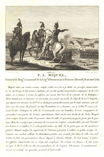 P. A. Miquel Gènèral de Brigde, Commandt de la Lègon d’Honneur, né à Beziers (Hèrault.) le 20 Janver 1762