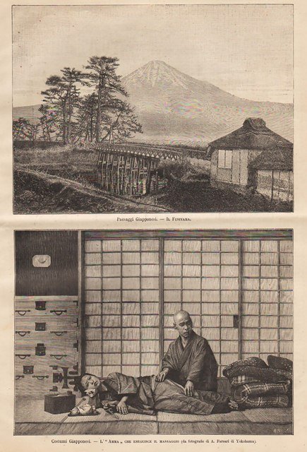 Paesaggi Giapponesi. Il Fusiyama - Costumi Giapponesi. L’Amma che esegue il massaggio