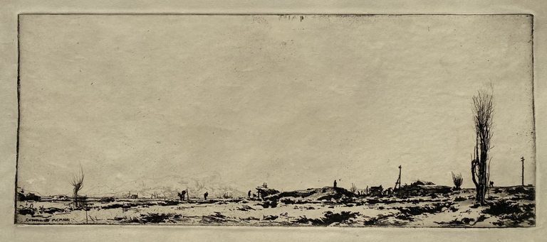 Paesaggio inanimato, silenzioso. L'uso capace della puntasecca definisce la profondità di campo e la luci. La linea piatta dell'orizzonte è interrotta da qualche albero spoglio, da qualche tetto in lamiera di costruzioni basse e, quasi invisibile sullo sfondo, il profilo di un monte. La dimensione della lastra ribadisce la piccolezza del paesaggio rispetto all'immensità del cielo immacolato. Firma incisa in basso a sinistra: Canonicus M MCMXXXI.