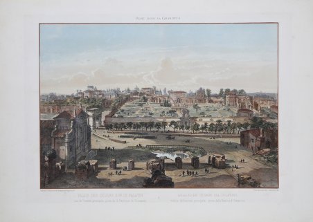 Veduta tratta dalla monumentale opera di Felix Benoist Rome dans sa grandeur. Vues, monument ancient et modernes stampata a Parigi in 3 volumi, da Henri Charpentier, nel 1870. La pubblicazione, illustrata da 100 litografie, fu preceduta da una campagna di disegni preparatori, a far data dal 1864 sino al 1869, eseguita soprattutto da Félix Benoist e in parte da Philippe Benoist. Alla vigilia del Concilio Ecumenico Vaticano I, l’11 agosto 1869, Pio IX decretava la realizzazione di una Esposizione romana delle opere d’ogni arte eseguite per il culto cattolico, che venne inaugurata, il 17 febbraio 1870, nel chiostro della Certosa di Santa Maria degli Angeli. In quell’occasione, vennero presentati i tre volumi in folio Rome dans sa grandeur. I volumi, rilegati in modo sfarzoso, con impresso al centro in oro, lo stemma di Pio IX, sono suddivisi in tre sezioni. Il primo volume tratta di Roma antica, il secondo, di Roma cristiana, ed il terzo, dei monumenti e le realizzazioni della Roma moderna. Una visione preziosa della Roma papale alla vigilia della profonda trasformazione di Roma in capitale dell’Italia unita. Un documento che evidenzia la notevole impronta lasciata da Pio IX nella Città Eterna. L’opera rappresenta il capolavoro dell’artista francese, dove ogni veduta è realizzata in litografia tinta, processo ottenuto usando un diverso numero di pietre. Il risultato è un’opera di grande effetto, tanto da porre il Benoist tra la schiera dei più grandi artisti di interni e vedute del suo tempo. Litografia tinta, finemente colorata a mano, in ottimo stato di conservazione. View taken from the monumental work of Felix Benoist Rome dans sa grandeur. Vues, monument ancient et modernes printed in Paris in 3 volumes, by Henri Charpentier, in 1870. The publication, illustrated by 100 lithographs, was preceded by a campaign of preparatory drawings, from 1864 to 1869, executed mainly by Felix Benoist and partly by Philippe Benoist. On the eve of the First Vatican Ecumenical Council, August 11, 1869, Pius IX decreed the creation of the Esposizione romana delle opere d’ogni arte eseguite per il culto cattolico (a Roman Exhibition of the works of art created for Catholic worship), which was inaugurated on February 17, 1870, in the cloister of the Charterhouse of Santa Maria degli Angeli. On that occasion, the three volumes in folio Rome dans sa grandeur were presented. The volumes, magnificently bound, with the coat of arms of Pius IX stamped in gold in the center, are divided into three sections. The first volume deals with ancient Rome, the second with “Christian” Rome, and the third with the monuments and achievements of modern Rome. A precious vision of papal Rome on the eve of the profound transformation of Rome into the capital of united Italy. A document that highlights the remarkable imprint left by Pius IX in the Eternal City. The work represents the masterpiece of the French artist, where each view is made in tinted lithography, a process achieved by using a different number of stones. The result is a work of great effect, so much so as to place Benoist among the ranks of the greatest artists of interiors and views of his time. Tinted lithograph, finely hand-colored, in excellent condition. Cfr.