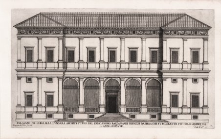 Della serie: Palazzi di Roma de' più celebri architetti designati da Pietro Ferrerio pittore et architetto. ' L'opera, progettata da Pietro Ferrerio intorno al 1638 circa, si compone di due volumi, di cui il primo sulle 44 tavole riporta il nome dell’autore solo in qualità di disegnatore, mentre non è noto chi fu l’incisore; il secondo volume, comprendente 61 tavole tutte incise da Giovanni Battista Falda, reca il titolo Nuovi disegni dell'architettura e piante de' palazzi de Roma de' piu celebri architetti, disegnati et intagliati da Gio. Battista Falda. La raccolta fu pubblicata dall'editore Gian Giacomo de Rossi, intorno al 1655 circa. Nella serie, i più importanti palazzi romani sono illustrati sia in alzato sia in pianta, a partire dall'età d'oro di Bramante, Raffaello, Peruzzi e Michelangelo per poi passare a Vignola, Ammannati, Ligorio, Della Porta, con, infine, un modesto spazio dedicato agli architetti del nuovo secolo, quali Bernini, Borromini e Domenico Fontana. Ogni tavola è corredata da un'iscrizione di carattere storico che riporta sempre, tra le altre notizie, il nome dell'architetto che progettò l'opera, e l'anno di inizio della costruzione. Le incisioni si caratterizzano per la precisione del disegno, l'attenzione verso il particolare e la nitidezza dell'immagine. L'opera costituisce una sorta di guida all'architettura romana tra Cinquecento e Seicento, di grande valore storico-documentario. ' Esemplare nel primo stato di due, avanti la numerazione. ' Acquaforte, impressa su carta vergata coeva, in buono stato di conservazione. Plate from the series Palazzi di Roma de' più celebri architetti designate da Pietro Ferrerio pittore et architetto. The work was projected and begun by Pietro Ferrerio in about 1638; the second book, Nuovi disegni delle architetture e piante dei palazzi di Roma de' più celebri architetti., was done by G. B. Falda, who was also the engraver, and was published in 1655 by G. G. De Rossi. Regarding the first book we do not know the name of the engraver: Ferrerio signs the plates only as a draftsman. The most important Roman building typologies are illustrated by Ferrerio both in elevation and in plan, starting from the golden age of Bramante, Raphael, Peruzzi and Michelangelo and then moving on to Vignola, Ammannati, Ligorio, Della Porta, finally dedicating a modest space to the architects of the new century, such as Bernini, Borromini or Domenico Fontana: This is an evident sign of how much the orientation of the culture and taste of the mature seventeenth century tended towards a recovery and a preference for sixteenth-century classicism or late counter-reformed Mannerism. Each panel is accompanied by a historical inscription that always reports, among other information, the name of the architect who designed the work, and the year in which construction began. The engravings are characterized by the precision of the drawing, the attention to detail and the sharpness of the image. The work constitutes a sort of guide to Roman architecture between the sixteenth and seventeenth centuries, of great historical-documentary value. Etching, printed on contemporary laid paper, in good condition. Cfr. TIB, 47, 2, p. 184