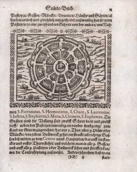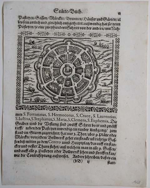 La xilografia costistuisce la PRIMA immagine a stampa di Palmanova. Fu pubblicata nel volume - rarissimo . Thatrum Urbium, di M. Abraham Saur, edito per la prima volta da Nikolaus Basse nel 1595, cioè appena due anni dopo la fondazione della fortezza, quando i lavori erano ancora allo stadio iniziale.Proprio per questa razione, la xilografia presenta elementi reali combinati con altri di pura fantasia: il numero dei bastioni, ad esempio, è corretto, ma non la loro forma; la pianta della piazza maggiore presenta pianta circolare invece che pentagonale; del tutto inattendibile è invece l'assetto degli isolati abitativi.Il testo che accompagna la carta, fornisce una desrizione delle caratteristiche di Palmanova, nonché della medaglia di sette metalli che fu coniata in occasione della posa della prima pietra della fortezza.Il Theatrum Urbium è un'opera geografica divulgativa. Sebbene non originale nei temi trattati e nell'apparato illustrativo, ottenne un apprezzabile successo, al punto da sei ristampe nel '500 e due nel '600. Nel 1581 fu pubblicata la prima edizione dell'opera priva del corredo iconografico. La prima edizione ilustrata è del 1587, con un numero di tavole che sarà incrementato nelle edizioni successive fino ad arrivare a 68 definitive, nell'edizione del 1595.Xilografia, in ottimo stato di conservazione. Esemplare tratto dall'edizione del 1658 del Theatrum Urbium. La xilografia costistuisce la PRIMA immagine a stampa di Palmanova. Fu pubblicata nel volume - rarissimo . Thatrum Urbium, di M. Abraham Saur, edito per la prima volta da Nikolaus Basse nel 1595, cioè appena due anni dopo la fondazione della fortezza, quando i lavori erano ancora allo stadio iniziale.Proprio per questa razione, la xilografia presenta elementi reali combinati con altri di pura fantasia: il numero dei bastioni, ad esempio, è corretto, ma non la loro forma; la pianta della piazza maggiore presenta pianta circolare invece che pentagonale; del tutto inattendibile è invece l'assetto degli isolati abitativi.Il testo che accompagna la carta, fornisce una desrizione delle caratteristiche di Palmanova, nonché della medaglia di sette metalli che fu coniata in occasione della posa della prima pietra della fortezza.Il Theatrum Urbium è un'opera geografica divulgativa. Sebbene non originale nei temi trattati e nell'apparato illustrativo, ottenne un apprezzabile successo, al punto da sei ristampe nel '500 e due nel '600. Nel 1581 fu pubblicata la prima edizione dell'opera priva del corredo iconografico. La prima edizione ilustrata è del 1587, con un numero di tavole che sarà incrementato nelle edizioni successive fino ad arrivare a 68 definitive, nell'edizione del 1595.Xilografia, in ottimo stato di conservazione. Esemplare tratto dall'edizione del 1658 del Theatrum Urbium. Cfr. Ghironi-Manno, Palmanova - Storia, progetti e cartografia urbana (1593- 1866), n. 12