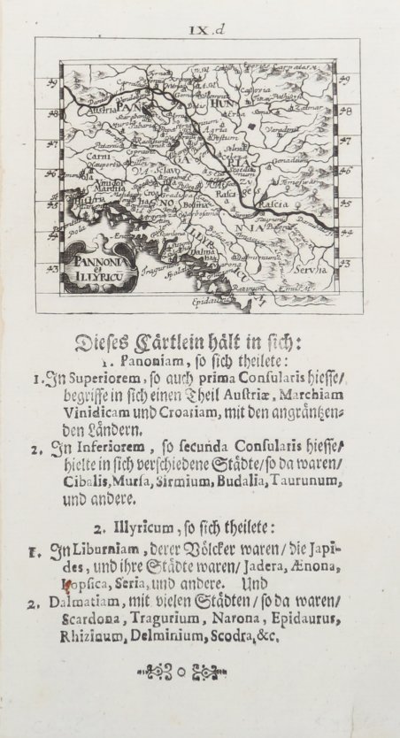 Carta geografica tratta dal raro "Neu-aussgeffertigte Kleiner Atlas", per la prima volta pubblicato nel 1692 e successivamente ristampato nel 1702. Tratte dell'edizione pubblicata a Francoforte nel 1702 presso Johann Philip Andrea. Le carte sono incise da G. Karsch e G. Bodeneher su disegno di Sigismund G. Hipschman.Incisione in rame, inserita in una pagina di testo, in eccellente stato di conservazione. Map taken from the rare "Neu-aussgeffertigte Kleiner Atlas", first published in 1692 and subsequently reprinted in 1702.From of the edition published in Frankfurt in 1702 by Johann Philip Andrea. The maps are engraved by G. Karsch and G. Bodeneher on a design by Sigismund G. Hipschman.Copper engraving, inserted in a text page, in excellent condition. Cfr.