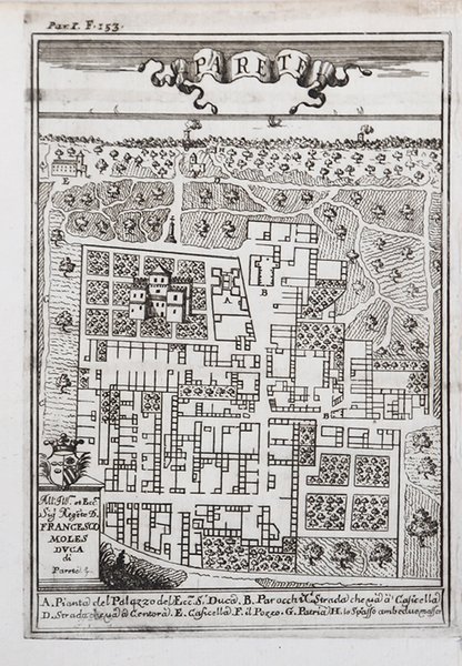 Veduta della città tratta da Il Regno di Napoli in prospettiva diviso in dodeci provincie, in cui si descrivono la sua metropoli fidelissima città di Napoli… Opera postuma divisa in tre parti dell'abate Gio. Battista Pacichelli parte prima [terza]. - In Napoli: nella stamperia di Michele Luigi Mutio, 1700 - 1703. Questa monumentale opera dell'abate Pacichelli si propone di raccontare la storia politico-militare, religiosa, urbanistica, economica ed artistica di 148 città e degli annessi territori, nelle 12 provincie costituenti quello che fu un tempo il Regno di Napoli. Di ogni singolo comune vengono narrate le origini, la situazione economica, le vicende storiche, la topografia e i monumenti, le opere letterarie, i culti e le reliquie dei Santi venerati. Valore aggiunto e parte integrante dei volumi di Pacichelli sono le nitide incisioni che ritraggono tutti i centri del regno napoletano realizzate da Michele Luigi Muzio e le carte geografiche opera di Francesco Cassiano De Silva. L'opera fu consegnata agli editori nel 1692, ma andò in stampa solo dopo la morte di Pacichelli (1695). ' Incisione in rame, in ottimo stato di conservazione. Rara. View of the city taken from Il Regno di Napoli in prospettiva diviso in dodeci provincie, in cui si descrivono la sua metropoli fidelissima città di Napoli. Opera postuma divisa in tre parti dell'abate Gio. Battista Pacichelli parte prima [terza . - In Naples: in the printing house of Michele Luigi Mutio, 1700-1703. This monumental work by Abbot Pacichelli sets out to recount the political-military, religious, urban, economic and artistic history of 148 cities and their annexed territories, in the 12 provinces that made up what was once the Kingdom of Naples. The origins, economic situation, historical events, topography and monuments, literary works, cults and relics of the saints venerated are described for each individual municipality. An added value and an integral part of Pacichelli's volumes are the sharp engravings depicting all the centres of the Neapolitan kingdom by Michele Luigi Muzio and the maps by Francesco Cassiano De Silva. The work was delivered to the publishers in 1692, but only went into print after Pacichelli's death (1695). ' Copperplate, in excellent condition. Rare. Cfr.