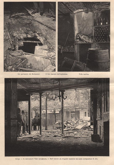 Vedute interne delle macerie del ristorante Very dopo l’esplosione provocata dal criminale e anarchico francese François Koenigstein, conosciuto come Ravachol (Saint-Chamond 1859 - Montbrison 1892). Testo al retro