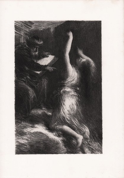 Litografia, 1886. La scena rappresenta un vecchio mago, seduto con un libro aperto sulle sue ginocchia, che chiama una figura femminile, che è inginocchiata a destra, con le braccia alzate; scena dall'opera di Wagner 'Parsifal' e illustrazione al volume 'Richard Wagner, sa vie et ses oeuvres' di Jullien pubblicato nel 1886 a Parigi da Libraire de L'Art e stampato da Lemercier et Cie. Henri Fantin Latour (Grenoble 1836 - Buré, Orne, 1906) fu per qualche tempo, a Parigi, nello studio di G. Courbet; ma soprattutto si formò copiando al Louvre i maestri dei secc. 16º e 17º. Ammirò Manet e gli impressionisti, ma non fece mai parte del loro gruppo. Fu amico di J. Whistler, del quale condivise lo spirito di fine psicologismo che pervade le sue opere. Tra i suoi dipinti più noti, conservati al museo d'Orsay a Parigi: Omaggio a Delacroix (1864), Studio a Batignolles (1870), Angolo di tavola (1872), Intorno al pianoforte (1885), ritratti di gruppo di pittori, poeti, musicisti, in cui, come nei numerosi ritratti individuali, la personalità del modello è interpretata con profonda intimità. Una sensibile osservazione della realtà si ritrova anche nelle nature morte, mentre un mondo irreale traspare da alcuni dipinti (La notte, 1897, Parigi, museo d'Orsay) e in numerose litografie ispirate dalla sua passione per la musica di Schumann, Wagner e Berlioz. Bibliografia Hédiard, Fantin-Latour: Catalogue de l'oeuvre lithographie du Maître 73; Fantin-Latour 1911 - Catalogue de l'Oeuvre Complet de Fantin-Latour 1325. Lithograph, 1886. The scene depicts an old magician, seated with open book on his knees, summons a female figure, who is kneeling at right, with her arms raised; scene from Wagner's opera 'Parsifal' and illustration to Jullien's 'Richard Wagner, sa vie et ses oeuvres' ' published in 1886 by Libraire de L’Art and printed by ' Lemercier et Cie ' (fl.1827–1899) in Paris. Henri Fantin Latour (Grenoble 1836 - Buré, Orne, 1906) fu per qualche tempo, a Parigi, nello studio di G. Courbet; ma soprattutto si formò copiando al Louvre i maestri dei secc. 16º e 17º. Ammirò Manet e gli impressionisti, ma non fece mai parte del loro gruppo. Fu amico di J. Whistler, del quale condivise lo spirito di fine psicologismo che pervade le sue opere. Tra i suoi dipinti più noti, conservati al museo d'Orsay a Parigi: Omaggio a Delacroix (1864), Studio a Batignolles (1870), Angolo di tavola (1872), Intorno al pianoforte (1885), ritratti di gruppo di pittori, poeti, musicisti, in cui, come nei numerosi ritratti individuali, la personalità del modello è interpretata con profonda intimità. Una sensibile osservazione della realtà si ritrova anche nelle nature morte, mentre un mondo irreale traspare da alcuni dipinti (La notte, 1897, Parigi, museo d'Orsay) e in numerose litografie ispirate dalla sua passione per la musica di Schumann, Wagner e Berlioz. References Hédiard, Fantin-Latour: Catalogue de l'oeuvre lithographie du Maître 73; Fantin-Latour 1911 - Catalogue de l'Oeuvre Complet de Fantin-Latour 1325. Cfr.