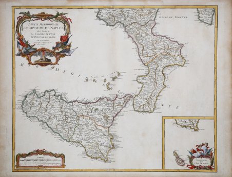 Carta geografica della Sicilia e Calabria intitolata “Partie Méridionale du Royaume de Naples”, esempio eccelso della produzione francese di metà settecento, disegnata da Gilles Robert de Vaugondy e suo figlio Didier nel 1750 ed edita a Parigi nel 1757 all'interno dell'Atlas Universel, non solo loro principale atlante, ma anche uno dei più importanti del XVIII secolo. I Robert de Vaugondy furono i cartografi più di successo in Francia durante l'Illuminismo, coprendo un lasso di tempo tra il 1730 ed il 1780; entrambi vennero nominati Géographe ordinaire du Roi, a dimostrazione della massima stima di cui godettero. Le loro mappe si segnalano sia per l'accuratezza e precisione, sia per la sobrietà e pulizia della composizione. Anche in questa carta geografica con la “Partie Méridionale du Royaume de Naples” la rappresentazione del territorio è accompagnata da eleganti inserti che abbelliscono senza appesantire, offrendo un senso di armonia e piacevole bellezza. ' Incisione in rame, coloritura coeva dei contorni con ritocchi, in buono stato di conservazione. This is an attractive 1750 map of southern Italy by Robert de Vaugondy. It covers the southern regions of the territories claimed by the Kingdom of Naples and extends from Agropoli south to include the island of Sicily. An inset in the bottom right quadrant features the Isle of Malta. Mt. Etna, the tallest active volcano in the region, is beautifully rendered. Sicily became a Greek colony around 750 BC and according to Greek mythology, the monster Typhon, is trapped under Mount Etna. Several important towns, cities, roads, rivers, lakes and other topographical features are noted throughout. A beautifully illustrated title cartouche adorns the top left quadrant of the map as well as the bottom right quadrant of the inset. This map was drawn by Robert de Vaugondy in 1750 and published in the 1757 issue of his Atlas Universal. The Atlas Universal was one of the first atlases based upon actual surveys. Therefore, this map is highly accurate (for the period) and has most contemporary town names correct. Copperplate with fine later hand colour, good condition. Cfr.