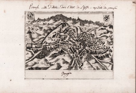 ESEMPLARE DI PRIMO STATO AVANTI IL TITOLO Pianta della città tratta da Heroico Splendore delle Città del Mondo, rarissima pubblicazione stampata per la prima volta a Roma nel 1639, e successivamente, ampliata con l’aggiunta di dieci nuove opere, nel 1642. In alto a sinistra lo stemma pontificio, a destra il grifo simbolo della città. Orientazione con una rosa dei venti, il nord, nord-ovest a destra. Lungo il bordo inferiore uno spazio bianco. Nella carta la città e raffigurata con una veduta prospettica e una pianta. L'opera deriva dalla tavola incisa da Raffaello Schiaminossi per Matteo Florimi nei primi del '600. Giacomo Lauro, fu incisore, stampatore e conoscitore di antichità attivo prevalentemente in ambito romano tra il 1583 e il 1645. Non si conosce la data e il luogo di nascita, ma il fatto che egli firmasse le sue opere come "Jacobus Laurus Romanus" lascia presumere che fosse originario di Roma. Nulla si conosce della sua formazione. La prima testimonianza documentaria che attesta la sua presenza a Roma, in cui è definito "intagliatore di rame romano", risale al 1583; mentre la sua prima stampa conosciuta è un Tiberio con la daga (o Il gladiatore), pubblicata da Claudio Duchetti nel 1585. Nonostante abbia affrontato tematiche storiche, mitologiche, devozionali, il Lauro è noto soprattutto per la produzione di piante e vedute di città, a cominciare dalla veduta a volo d'uccello di Rocca Contrada (Arcevia), realizzata nel 1594 per Angelo Rocca su disegno di Ercole Ramazzani. Negli anni 1630-45, Lauro si dedicò alla pubblicazione di una serie di piante e descrizioni di città italiane e straniere in forma di piccoli opuscoli, alcuni dei quali furono raccolti nel 1639 sotto il titolo di Heroico splendore delle città del mondo. Le piante di Lauro, dunque, furono il frutto di un lungo lavoro di ricerca, basato su fonti primarie, e pubblicato per la prima volta in libri o opuscoli con testo relativo alla storia della città. Scrive Thomas Ashby: “Negli anni 1630-1645 il Lauro pubblicò un numero rilevante di descrizioni di città in tanti opuscoli col testo, tutti in folio piccolo oblungo. Le piante non sono tutte originali […] Molte volte sono state adoperate come fonti, s’intende, le belle tavole dell’atlante del Lafrèry. Ma anche altre piante sono state messe sotto contributo - molto è stato preso o dall’opera di Braun e Hogenberg, Civitales Orbis Terrarum, oppure anche in questo caso da fonti comuni. Non mancano i contatti con Matteo Florimi di Siena, il quale in nessun caso compì di opera propria, ma copiò sempre i lavori degli altri. La pianta di Viterbo, finalmente, è derivata dalla pianta di Tarquinio Ligustri di Viterbo, fatta nel 1596 e dedicata al Cardinale Odoardo Farnese, Alcune di queste piante furono raccolte sotto il titolo seguente, inciso nel 1639; HEROICO SPLENDORE DELLE CITTA DEL MONDO LIBRO PRIMO DI IACOMO LAURO ROMANO Dove si uedono le piante di molte Citta Ill.ri e di molte non più state alla stampa con le loro origini et atti segnalati, et quanto si estende il dominio di esse sino alli presenti tempi in Roma l’Anno di nostra salute 1639” (cfr. Thomas Ashby, L'Heroico splendore delle città del mondo, in “La Bibliofilia”, XXXI (1929), pp. 105-122). L’opera venne ristampata nel 1642 con imprint in Roma l’Anno di nostra salute 1642 /Con priuilegio del somo Pontefice, et d'altri Potent.ti Con licenza de Superiori. Sebbene nel frontespizio si parli di “Libro primo” un secondo volume della raccolta non venne mia pubblicato. Incisione in rame, stampata su carta vergata coeva, con margini, leggerissime ossidazioni, per il resto in ottimo stato di conservazione. Rarissima. Bibliografia Ashby (1929): p. 120, n. 44; Cremonini (1991): pp. 37-38, n. 4; Ganado (1994): p. 168, n. 17; ' Thomas Ashby, Un incisore antiquario del Seicento, I, Note intorno alla vita ed opere di Giacomo Lauro, in “La Bibliofilia”, XXVIII (1926-27), pp. 361-373; II, L'opera "Antiquae. Map of the city taken from ' Heroico Splendore delle Città del Mondo, ' a very rare publication printed for the first time in Rome in 1639, and later, expanded with the addition of ten new works, in 1642. Giacomo Lauro, was an engraver, printer and connoisseur of antiquities active mainly in Rome between 1583 and 1645. We do not know the date and place of birth, but the fact that he signed his works as "Jacobus Laurus Romanus" suggests that he was a native of Rome. Nothing is known about his education. The first documentary evidence of his presence in Rome, in which he is defined as a "Roman copper engraver", dates back to 1583; while his first known print is a ' Tiberius with a dagger ' (or ' The Gladiator), published by Claudio Duchetti in 1585. Although he dealt with historical, mythological, devotional themes, Lauro is mainly known for the production of plans and views of cities, starting with the bird's eye view of Rocca Contrada (Arcevia), made in 1594 for Angelo Rocca on a drawing by Ercole Ramazzani. In the years 1630-45, Lauro dedicated himself to the publication of a series of maps and descriptions of Italian and foreign cities in the form of small pamphlets, some of which were collected in 1639 under the title of ' Heroico Splendore delle Città del Mondo. Lauro's plans, therefore, were the result of a long research work, based on primary sources, and published for the first time in books or pamphlets with text related to the history of the city. Thomas Ashby writes: "In the years 1630-1645 the Lauro published a considerable number of descriptions of cities in many pamphlets with text, all in small oblong folio. The plants are not all original [.] Many times have been used as sources, of course, the beautiful plates of the Atlas of Lafrèry. But other maps were also contributed - much was taken either from the work of Braun and Hogenberg, ' Civitales Orbis Terrarum, or even in this case from common sources. There is no lack of contact with Matteo Florimi of Si
