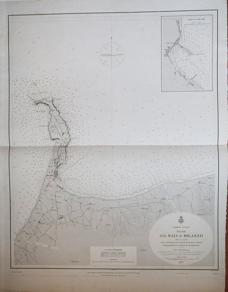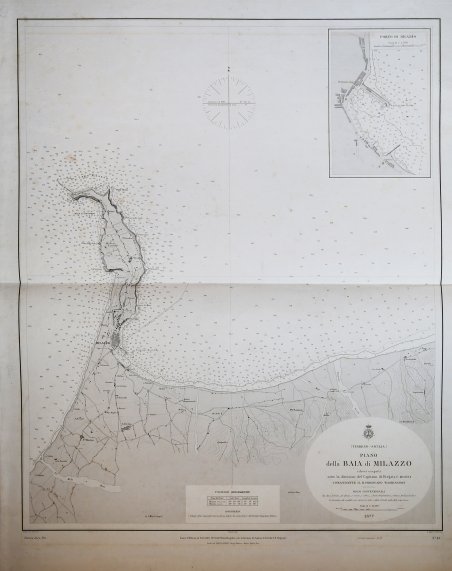 Carta nautica stampata dall’Istituto Idrografico della Marina. Aggiornata al 1882. La storia dell'Istituto Idrografico della Marina inizia pochi anni dopo l'unificazione nazionale con la creazione a Livorno, nel 1875, dell'Ufficio Centrale per il Servizio Scientifico della Regia Marina, dal quale avrebbero dovuto dipendere Uffici Dipartimentali eredi delle funzioni di elaborazione cartografica proprie delle istituzioni preunitarie. Fu invece creato il solo Ufficio Dipartimentale di Genova, presso il Forte San Giorgio, che a sua volta lasciò il posto, nel 1872, dall'ente cartografico nazionale denominato Ufficio Idrografico della Regia Marina. Nel 1899 tale denominazione fu trasformata in quella attuale di Istituto Idrografico della Marina. L'istituto fu fondato con regio decreto il 26 dicembre 1872 e alla sua guida fu chiamato il capitano di fregata, matematico e idrografo Giovan Battista Magnaghi, con il compito di eseguire il rilievo idrografico dei mari italiani e di produrre la documentazione nautica nazionale. Nel dopoguerra, oltre a ricognizioni per procedere all'aggiornamento delle carte nautiche, venne realizzata una nuova rete di triangolazione costiera. Incisione su zinco, con margini, in buono stato di conservazione. Bibliografia Amedeo Benedetti, L'Istituto Idrografico della Marina, in Charta Geographica, 93, ottobre 2007, pp. 12–13; Paola Presciuttini, L'Istituto Idrografico della Marina in Forte San Giorgio, Genova, I.I.M., 1995. The history of the Istituto Idrografico della Marina began a few years after the national unification with the creation in Livorno, in 1875, of the Ufficio Centrale per il Servizio Scientifico della Regia Marina, which should have depended on Departmental Offices heirs of the functions of cartographic processing of pre-unitary institutions. It was instead created only the Ufficio Dipartimentale di Genova, at Forte San Giorgio, which in turn left the place, in 1872, by the national mapping body called Ufficio Idrografico della Regia Marina. In 1899 this name was changed to the current name of Istituto Idrografico della Marina. The institute was founded by royal decree on 26 December 1872 and at its head was called the frigate captain, mathematician and hydrographer Giovan Battista Magnaghi, with the task of performing the hydrographic survey of the Italian seas and to produce the national nautical documentation. After the war, in addition to reconnaissance to update the nautical charts, a new coastal triangulation network was created. Engraving on zinc, with margins, in good condition. Bibliografia Amedeo Benedetti, L'Istituto Idrografico della Marina, in Charta Geographica, 93, ottobre 2007, pp. 12–13; Paola Presciuttini, L'Istituto Idrografico della Marina in Forte San Giorgio, Genova, I.I.M., 1995. Cfr.