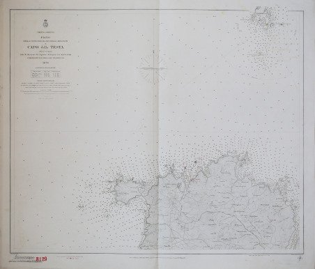 Carta nautica stampata dall’Istituto Idrografico della Marina. Aggiornata al 1880. La storia dell'Istituto Idrografico della Marina inizia pochi anni dopo l'unificazione nazionale con la creazione a Livorno, nel 1875, dell'Ufficio Centrale per il Servizio Scientifico della Regia Marina, dal quale avrebbero dovuto dipendere Uffici Dipartimentali eredi delle funzioni di elaborazione cartografica proprie delle istituzioni preunitarie. Fu invece creato il solo Ufficio Dipartimentale di Genova, presso il Forte San Giorgio, che a sua volta lasciò il posto, nel 1872, dall'ente cartografico nazionale denominato Ufficio Idrografico della Regia Marina. Nel 1899 tale denominazione fu trasformata in quella attuale di Istituto Idrografico della Marina. L'istituto fu fondato con regio decreto il 26 dicembre 1872 e alla sua guida fu chiamato il capitano di fregata, matematico e idrografo Giovan Battista Magnaghi, con il compito di eseguire il rilievo idrografico dei mari italiani e di produrre la documentazione nautica nazionale. Nel dopoguerra, oltre a ricognizioni per procedere all'aggiornamento delle carte nautiche, venne realizzata una nuova rete di triangolazione costiera. Incisione su zinco, con margini, in buono stato di conservazione. Bibliografia Amedeo Benedetti, L'Istituto Idrografico della Marina, in Charta Geographica, 93, ottobre 2007, pp. 12–13; Paola Presciuttini, L'Istituto Idrografico della Marina in Forte San Giorgio, Genova, I.I.M., 1995. The history of the Istituto Idrografico della Marina began a few years after the national unification with the creation in Livorno, in 1875, of the Ufficio Centrale per il Servizio Scientifico della Regia Marina, which should have depended on Departmental Offices heirs of the functions of cartographic processing of pre-unitary institutions. It was instead created only the Ufficio Dipartimentale di Genova, at Forte San Giorgio, which in turn left the place, in 1872, by the national mapping body called Ufficio Idrografico della Regia Marina. In 1899 this name was changed to the current name of Istituto Idrografico della Marina. The institute was founded by royal decree on 26 December 1872 and at its head was called the frigate captain, mathematician and hydrographer Giovan Battista Magnaghi, with the task of performing the hydrographic survey of the Italian seas and to produce the national nautical documentation. After the war, in addition to reconnaissance to update the nautical charts, a new coastal triangulation network was created. Engraving on zinc, with margins, in good condition. Bibliografia Amedeo Benedetti, L'Istituto Idrografico della Marina, in Charta Geographica, 93, ottobre 2007, pp. 12–13; Paola Presciuttini, L'Istituto Idrografico della Marina in Forte San Giorgio, Genova, I.I.M., 1995. Cfr.