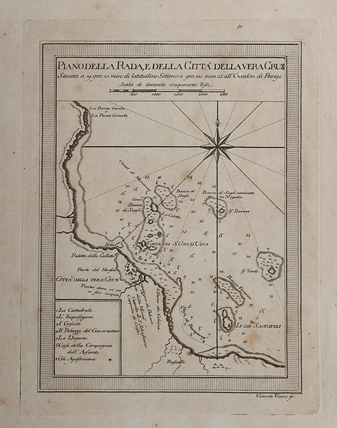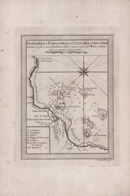 Carta geografica tratta dal raro "Il Gazzettiere Americano" edito dalla tipografia di Marco Coltellini nel 1763"Il Gazzettiere americano, contenente un distinto ragguaglio di tutte le parti del Nuovo Mondo", in 3 volumi, con testi curati da Giuseppe Pazzi, rappresenta la prima traduzione italiana, arricchita di note e carte, del "The American Gazetteer" pubblicato l'anno prima a Londra da Millar&Tonson. La traduzione italiana ottenne un ottimo successo di vendita.I disegni e le carte che corredano l'atlante, sono derivate dai modelli del cartografo francese Jacques Nicolas Bellin, usate per sia per il "Petit Atlas Maritime" che per "Histoire Generales de Voyages", rispetto alle quali son tuttavia arricchite da cartigli decorativi e finemente incise. Le opere portano le firme di Veremondo Rossi, Andrea Scacciati, Giuseppe Maria Terreni e anche Violante Vanni, un raro caso italiano di impegno femminile in campo cartografico. Incisione su rame, in ottimo stato di conservazione. Map from "Il Gazzettiere Americano", including maps after Nicolas Bellin. The atlas, in 3 volumes, with texts written by Giuseppe Pazzi, is the first Italian translation, enriched with notes and maps of "The American Gazetteer" published the year before in London by Millar & Tonson. The maps accompanying the atlas are derived from the French cartographer Jacques Nicolas Bellin, used for both the "Petit Atlas Maritime" and for "Histoire Generales de Voyages", with respect to which, however, are embellished with decorative cartouches and finely engraved. The works bear the signatures of Veremondo Rossi, Andrea Scacciati, Giuseppe Maria Terreni and also Violante Vanni, a rare case of Italian women's engagement in the cartographic field.Copperplate, showing the usual folds, wide margins, two small warm holes, generally in very good condition. Rare. Cfr.