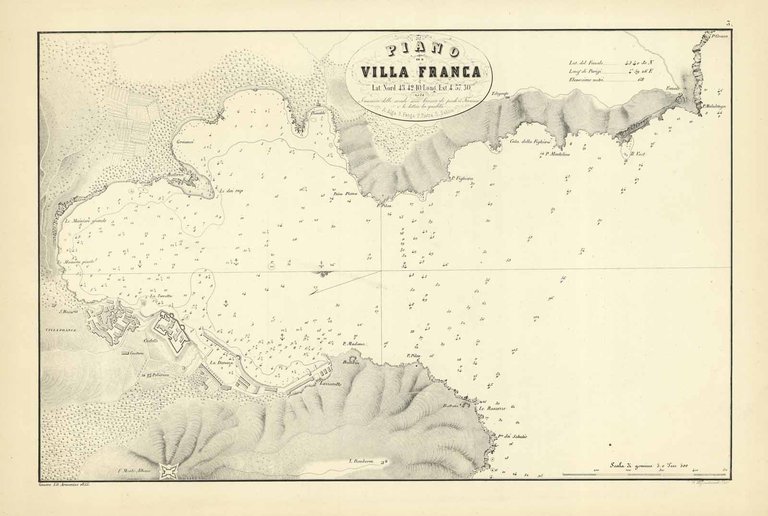 Raffigurazione planimetrica della città e del porto di Villafranca ed attenta rappresentazione topografica del territorio circostante. In alto al decorativo cartiglio in cui è inserito il titolo, la posizione della città in base a latitudine e longitudine ed importante nota in cui viene specificato che i numeri delle sonde sono "braccia di piedi 5 francesi e le lettere la qualità". Nell'angolo in basso a destra è riportata la scala grafica di "gomine 5 o Tese 500".La mappa fa parte della raccolta realizzata dal Vice Ammiraglio della Reale Marina Michele Giuseppe Albini, intitolata "Portolano della Liguria". Questi si era accorto che nei portolani del mediterrraneo veniva fatta scarsa o nessuna menzione dei porti e delle rade della Liguria. ".venendo in oggi questo tratto di costa molto frequentato da bastimenti d'estere bandiere i quali fanno anche operazioni commerciali in alcuna di tale rade, io pensai che non sarebbe tornato soverchio ed infruttuoso al commercio ed ai naviganti che approdano in quei punti del territorio marittimo de nostri stati di terraferma la pubblicazione di un Portolano speciale.". L'attento lavoro di rilevazione svolto garantì, oltre alla misurazione delle profondità, anche l'indicazione della qualità del fondale espresso sulla carta con l'utilizzo delle lettere. Troviamo così specificato se vi era presenza di sabbie, fanghi, pietre o alghe.