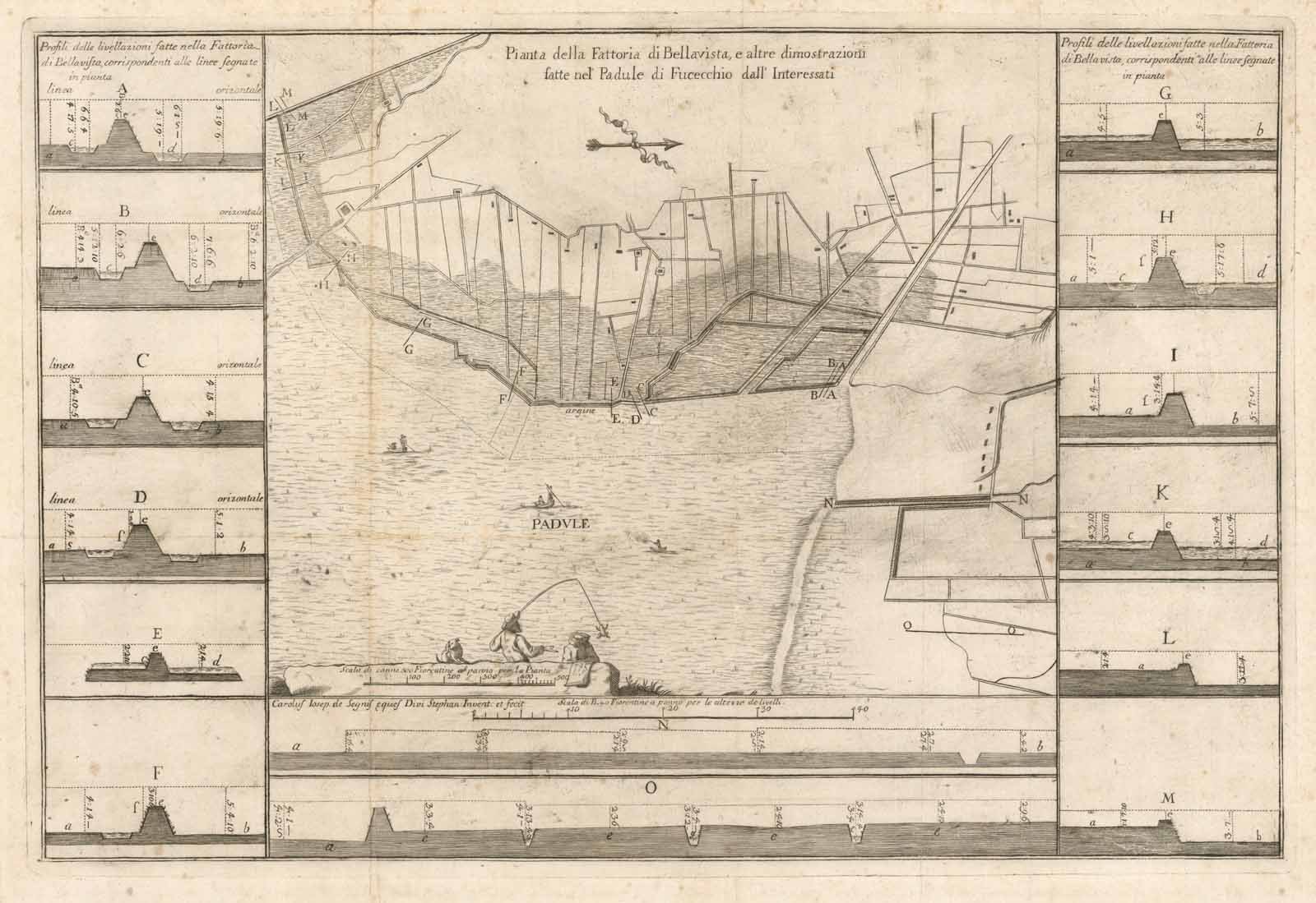 Raffigurazione in pianta della Fattoria di Bellavista nella palude di Fucecchio. Intorno alla raffigurazione centrale sono presentati i profili delle livellazioni fatte nella Fattoria di Bellavista corrispondenti a quelle segnate in pianta. Curiosa la raffiguraizone di un personaggio intento nella pesca delle rane. Pieghe editoriali.