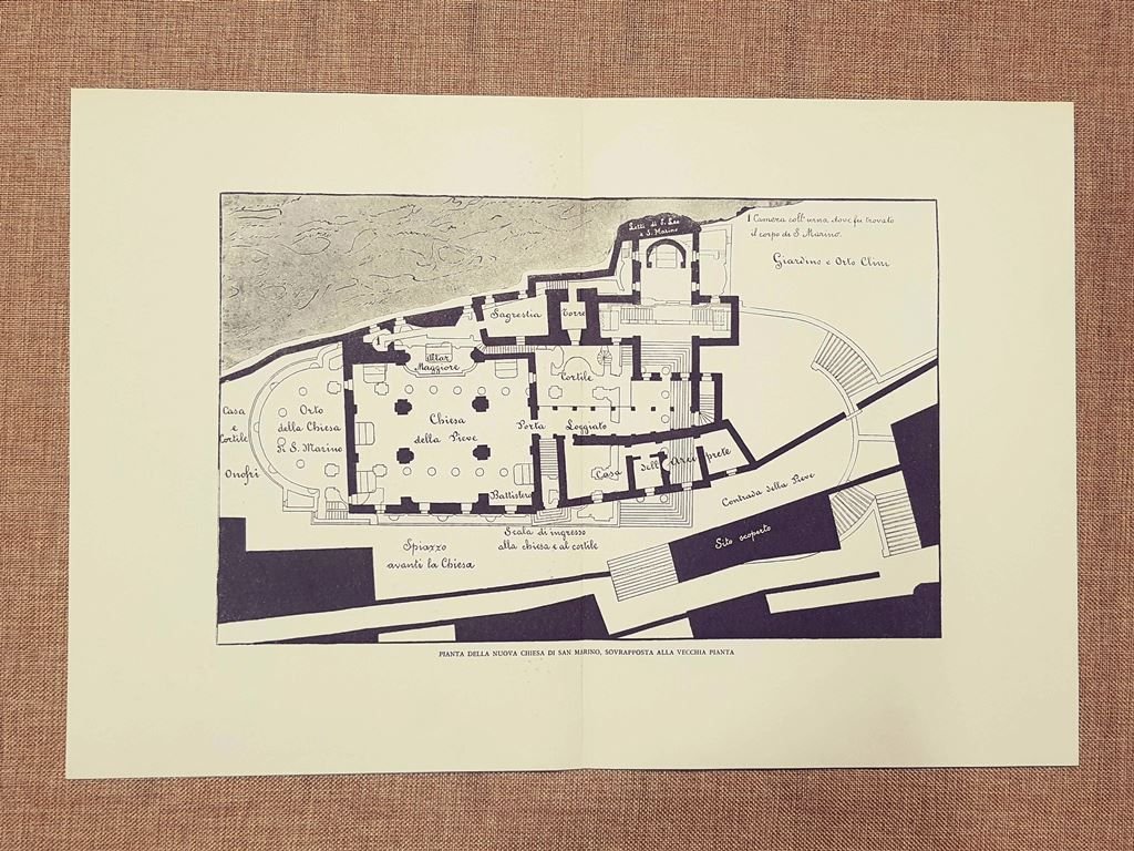 Pianta della nuova Chiesa di San Marino sovrapposta alla vecchia Stampa del 1999 Rara stampa estratta da pubblicazione del 1999 Pianta della nuova Chiesa di San Marino sovrapposta alla vecchia Codice prodotto: S.I. - 061 Dimensioni: Cm 28,00 x 42,00