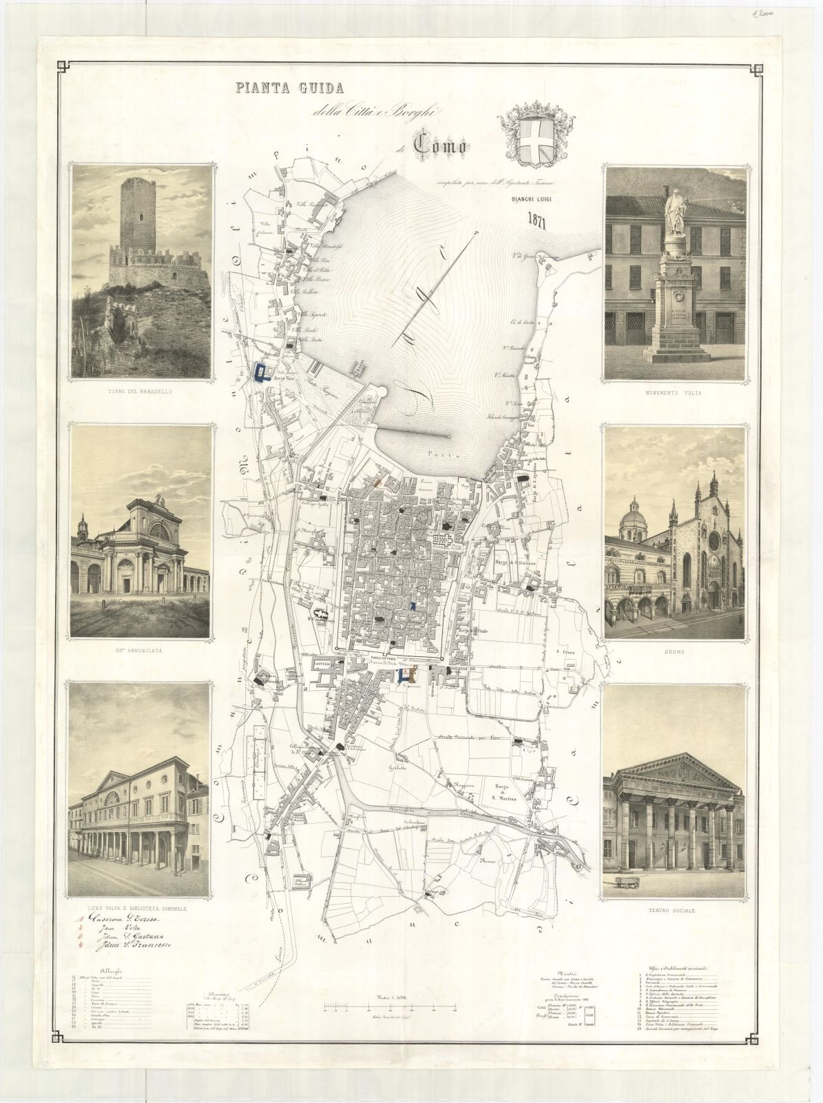 La pianta "Compilata per cura dell'Ajutante Tecnico Luigi Bianchi" nel 1871 sostanzialmente mostra ancora la città di epoca neoclassica, fatta eccezione per l'avvenuta sistemazione della zona a lago. Se si esclude l'intererramento dell'antico porto lacuale con la conseguente creazione di Piazza Cavour e la sistemazione del frastagliato fronte cittadinoverso il lago, i cambiamenti più rilevanti si avranno nella zona compresa tra l'estremo occidentale della città murata e la chiesa di S. Giorgio in Borgo Vico, conosciuta come "Prato Pasquèe": un'area paludosa inondata dalle acque del Cosia, prima che questo sfociasse nel lago. I primi lavori di bonifica verranno intrapresi solo verso la fine del '700, mentre dalla metà del secolo successivo diventerà oggetto dell'espansione urbana. I primi lavori in ordine di tempo furono i Giardini Pubblici che costituiscono la prima area verde pubblica attrezzata della città. Questi non furono interessati da particolari intervento paesaggistici, se non la rotonda a lago che diventerà il miglior punto panoramico da cui apprezzare il Borgo Vico, il fronte della città e punta Geno. Dopo la realizzazione dei giardini la destinazione ricreativa del luogo sarà rafforzata dalla costruzione dei Bagni Pubblici. Proprio a fianco allo sbocco del Cosia, l'Ing. Cadenazzi disegnò un grande edificio ad U che accoglieva tutte le cabine ed i servizi. Lo specchio d'acqua al centro era la vasca per i bagni; solo successivamente, fuori dal perimetro dell'edificio, sarà aggiunta un'altra vasca laterale, quale spazio riservato alle donne. Infine, a fianco dei Bagni, si noti la realizzazione dei cantieri della Società Lariana di Navigazione, progettati dall'Ing. Ferrario. Completano la composizione sei vedute stampate in litografia su fondo seppia, che oltre al Duomo ed al Castel Baradello mostrano: il Liceo del Cantoni, il Teatro del Cusi, la statua di Volta del Marchesi e la tarda, seppur neoclassica, facciata dell'Annunciata del Fontana. (Cani, Monizza 1984) In calce: 29 rimandi alla carta disposti su due colonne, a destra Elenco degli Uffici, a sinistra degli Alberghi cittadini, mentre al centro Idrometro delle altezze del lago, e Popolazione giusta l’ultimo censimento 1862. In basso a sinistra si trova elenco manoscritto delle caserme militari di S. Teresa, Volta, S. Gaetano e S. Francesco.Rif: Margheritis, Sinistri, Invernizzi, Peverelli "Il lago di Como nelle antiche stampe", p. 248, n° 241; Trippini Francesco "Elogio del Lago", p. 230
