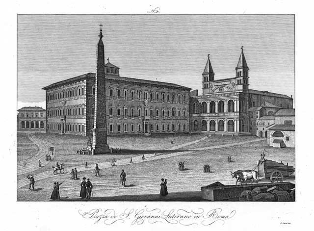 Veduta, animata da personaggi, della piazza e dell'obelisco