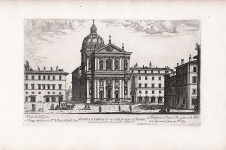 Bella veduta della chiesa di S. Carlo ai Catinari, situata in piazza B. Cairoli, dopo i lavori di ampliamento della piazza promossi da papa Alessandro VII. La denominazione "ai Catinari" deriva dalle antiche botteghe di fabbricanti di catini che si trovavano in questa zona. Fu eretta per i Barnabiti tra il 1612 ed il 1620, in onore del cardinale Carlo Borromeo da poco canonizzato. La piazza antistante fu aperta sotto il pontificato di Alessandro VII. Esemplare di primo stato, avanti la numerazione, tratto da ' Il nuovo teatro delle fabriche, et edificii, in prospettiva di Roma moderna, sotto il felice pontificato di N. S. papa Alessandro VII. ' Opera in tre volumi, edita da Giovanni Giacomo de Rossi tra il 1665 e il 1669, illustra le fabbriche realizzate o ampliate durante il pontificato di Alessandro VII Chigi, mentre il III si riferisce alle chiese restaurate dal pontefice Clemente IX. ' L'opera aveva lo scopo di divulgare la nuova immagine di Roma, con i suoi palazzi, chiese e giardini, secondo un progetto unitario di espansione urbana, in sintonia con i criteri del colto e raffinato Fabio Chigi: il papa, infatti, decise di aprire nuove strade, di abbellire con fontane e monumenti la città, anche a dimostrazione della potenza finanziaria e culturale della sua famiglia. Prima di allora l'incisione di veduta a Roma, che pure aveva prodotto numerose serie dì stampe da Etienne Dupérac a Giacomo Lauro, si era interessata principalmente alla ripresa della città antica. Bisognerà attendere proprio il completamento dei rinnovamenti urbanistici e delle realizzazioni architettoniche dei papi seicenteschi, per assistere alla diffusione di raccolte dedicate alla città moderna. ' Giovan Battista Falda ha contribuito, con la vasta serie di incisioni di vedute, a divulgare un'immagine della città di Roma legata alla magnificenza e munificenza dei Papi seicenteschi: città ricca di chiese, palazzi, giardini che si affiancavano ai resti del glorioso passato. ' L'incisore dedicò tutta la sua pur breve vita a creare, attraverso precise ed attente vedute prospettiche, piante e stampe su avvenimenti cittadini, canonizzazioni, ingressi di pontefici e reali stranieri, un grosso affresco unitario che celebrasse nel suo insieme la nuova grandezza raggiunta dalla Roma moderna, grazie soprattutto alla geniale e lungimirante opera di papa Alessandro VII Chigi (1655 - 1667). ' Dopo la morte del Falda, verrà pubblicato, sempre dalla tipografia De Rossi, ' Il quarto libro del nuovo teatro delli palazzi in prospettiva di Roma moderna dato in luce sotto il felice pontificato di nostro signore papa Innocenzo XII, di Alessandro Specchi, edito nel 1699 e naturale prosecuzione della raccolta. ' Acquaforte, impressa su carta vergata coeva, con margini, in ottimo stato di conservazione. Beautiful view of the church of S. Carlo ai Catinari. The church was commissioned by the Order of the Barnabites and funded by the Milanese community in Rome to honour their fellow Milanese St. Charles Borromeo. It is located on Piazza Benedetto Cairoli. The attribute ai Catinari refers to the presence, at the time of its construction, of many dishmaker shops in the same street as the church. Example in the first state, before the number, taken from ' Il nuovo teatro delle fabriche, et edificii, in prospettiva di Roma moderna, sotto il felice pontificato di N. S. papa Alessandro VII. ' One of the most important architectural projects of the seventeenth century was the urban renovation of Rome. Under the brilliant leadership of Pope Alessandro VII (1655-1667), Rome dramatically emerged as one of the most modern and beautiful cities of the new Baroque age. Within several decades spacious roadways were constructed, monumental buildings arose, and many public squares appeared with elaborate fountains and monuments. To be sure, this massive undertaking was meant to underline the absolute power of the Papacy but it also brought forth a new flowering of Italian art and architecture. ' ' The ' Nuovo Teatro ' was initiated in 1665 to depict the new Rome in a series of etchings. What it gave to future generations was a magnificent historical record of views etched by two of Italy's greatest architectural artists. ' The printing and publishing of these important etchings was entrusted to Giacomo de Rossi (1626-1691), the head of the most dominant Roman publishing house. ( Sons and nephews of de Rossi, in fact, continued the publishing house until 1738 when the business was sold to Pope Clement XII to form the basis of the ' Regia Calcografia.) ' ' Altogether, four sets of ' Nuovo Teatro ' were created during the seventeenth century. Volumes one and two were both published in the year of 1665 and dealt mainly in views of the new piazzas, gardens, terraces and their surrounding buildings. Volume 3 was published in 1669 and concentrated upon the newly constructed churches of Rome. Every plate from the first three sets was both designed and etched by the influential architectural artist, Giovanni Battista Falda (1643-1678). ' For reasons unknown the fourth and final volume ' Il quarto libro del nuovo teatro delli palazzi in prospettiva di Roma moderna dato in luce sotto il felice pontificato di nostro signore papa Innocenzo XII, (52 etchings) did not appear until 1699. ' It was published by Giacomo's successor, Domenico de Rossi, and featured views of the palaces and stately homes of Rome. Each plate was designed and etched by the famous architect and etcher, Alessandro Specchi (1668-1729). ' ' Etching, printed on contemporary laid paper, with margins, in good condition. Cfr.