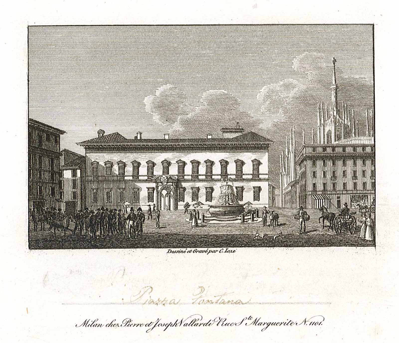 Veduta di Piazza Fontana a Milano. Titolo manoscritto con inchiostro bruno. Rif: Arrigoni, "Milano nelle vecchie stampe", vol I, p. 52, n° 160