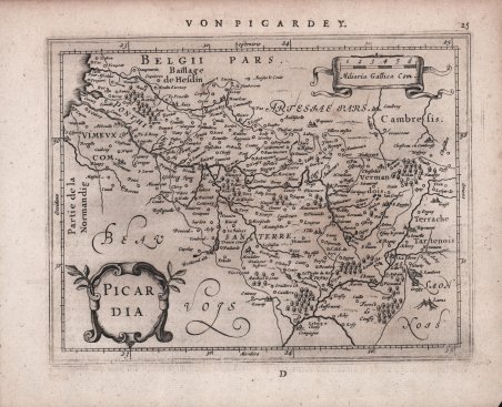 Mappa in miniatura tratta dall’Atlas minor, Das ist: Eine kurtze, jedoch gründliche Beschreibung der gantzen Weldt. ' Incisa da Abraham Goos o Pieter van den Keere, venne pubblicata per la prima volta da Johannes Janssonius nel 1628. L'Atlas Minor ' di Gerard Mercator fu concepito da Jodocus Hondius nel 1607 come edizione ridotta del popolare ' Atlas ' di Mercator in folio. L'Atlas Minor ' doveva essere più grande di un atlante tascabile, ma più piccolo di un atlante in folio, e aveva un prezzo adeguato a raggiungere una diversa clientela. Ci furono tre diverse edizioni dell'Atlas Minor ' pubblicate da autori diversi, ognuna con una nuova serie di mappe incise in rame. Jodocus Hondius pubblicò la prima edizione tra il 1607 e il 1621, e successivamente vendette le tavole in rame ad editori inglesi; tra il 1635-39 fu pubblicata un'edizione inglese dell’opera utilizzando molte delle tavole originali. Johannes Janssonius volle competere anche nel mercato dei “piccoli” atlanti e fece incidere nuove lastre di rame da Pieter van den Keere e Abraham Goos per la propria edizione dell’Atlas Minor, pubblicata in più lingue tra il 1628 e il 1651 La terza e ultima versione fu pubblicata da Jan Evertsz. Cloppenburch (o Cloppenburg) tra il 1630 e il 1734, con nuove mappe incise principalmente sempre da Pieter van den Keere. "Shortly after the publication of the big folio-atlases the need was apparantly felt for a smaller-sized atlas, one that would be handier, and, above all, cheaper, so that a larger public might have access to the use of maps. The publication of the ' Atlas Minor ' appeared to be a great success for Hondius; the first Latin edition was in great demand. The copperplates of the first atlases minor were most almost certainly engraved by Jodocus Hondius himself. After 1621, the copperplates of the ' Atlas Minor ' were sold to a London editor. Firstly, they appeared in ' Purchas his Pilgrinies, printed in 1625 by William Stansby for Henry Featherstone. Next they were used for the translation of the Mercator-atlas, printed in small folio under the title ' Historia mundi, or Mercators atlas, ' by Thomas Cotes for Michael Sparke and Samuel Cartwight in 1635". (cf. Koeman II Me 191). "As with the ' Theatrum ' of Abraham Ortelius, Jodocus Hondius planned a reduced size version of Gerard Mercator's folio atlas. Just one year after his first edition he published his Latin text ' Atlas Minor ' in collaboration with Jan Jansz. and Cormelis Claesz. The arrangement between these three is not understood clearly but Hondius is believed to have been the owner of the copperplates. Cartographically this is taken directly from the folio maps by Hondius in 1606 [.]. with the inevitable loss of detail due to the reduction” (cf. Burden, ' The Mapping of North America, 153). ' Johannes Janssonius (1588-1664) era figlio di un omonimo tipografo, editore e libraio di Arnhem. Nel 1612 sposò Elisabetta Hondius, figlia di Jodocus Hondius I, e nello stesso anno fondò una propria casa editrice ad Amsterdam. Alla morte di Jodocus I, nello stesso anno, iniziò ad aiutare la vedova di Hondius a continuare la pubblicazione dell'atlante di Mercatore e Hondius. Sia la vedova di Hondius, Colette, sia il figlio maggiore di Hondius, Jodocus II, morirono nel 1629; Janssonius unì quindi le forze con il figlio minore di Hondius, Henricus, per una revisione dell'Atlas Novus, a partire dal 1638. Acquaforte, in ottimo stato di conservazione. Dall’edizione tedesca dell’Atlas Minor, stampata ad Amsterdam nel 1648. Bibliografia Koeman IIIB, 352:33. A miniature map taken from ' Atlas minor, Das ist: Eine kurtze, jedoch gründliche Beschreibung der gantzen Weldt. ' Engraved by Abraham Goos or Pieter van den Keere, first issued by Johannes Janssonius in 1628. Mercator's ' Atlas Minor ' was conceived by Jodocus Hondius in 1607 as a reduced-sized edition of the popular folio-sized Mercator Atlas. The ' Atlas Minor ' was intended to be larger than a pocket atlas, yet smaller than the folio atlas, and were priced accordingly to reach a new market. There were three different editions of the ' Atlas Minor ' published by different authors, each with a new set of copperplates. Jodocus Hondius published the first edition from 1607-1621, and subsequently sold the copperplates to parties in England between 1621-1625, after which an English edition was published using many of the original plates in 1635-39. Johannes Jansson wanted to compete in the small atlas market as well, and had new copperplates engraved by Pieter van den Keere and Abraham Goos for his own edition published in multiple languages between 1628-51. The third and final edition was published by Jan Evertsz. Cloppenburch (or Cloppenburg) between 1630-1734 (some without text), with new maps engraved primarily by Pieter van den Keere. "Shortly after the publication of the big folio-atlases the need was apparantly felt for a smaller-sized atlas, one that would be handier, and, above all, cheaper, so that a larger public might have access to the use of maps. The publication of the ' Atlas Minor ' appeared to be a great success for Hondius; the first Latin edition was in great demand. The copperplates of the first atlases minor were most almost certainly engraved by Jodocus Hondius himself. After 1621, the copperplates of the ' Atlas Minor ' were sold to a London editor. Firstly, they appeared in ' Purchas his Pilgrinies, printed in 1625 by William Stansby for Henry Featherstone. Next they were used for the translation of the Mercator-atlas, printed in small folio under the title ' Historia mundi, or Mercators atlas, ' by Thomas Cotes for Michael Sparke and Samuel Cartwight in 1635". (cf. Koeman II Me 191). "As with the ' Theatrum ' of Abraham Ortelius, Jodocus Hondius planned a reduced size version of Gerard Mercator's folio atlas. Just one year after his first edition he published his Latin text ' Atlas Minor ' in collaboration with Jan Jansz. and Cormelis Claesz