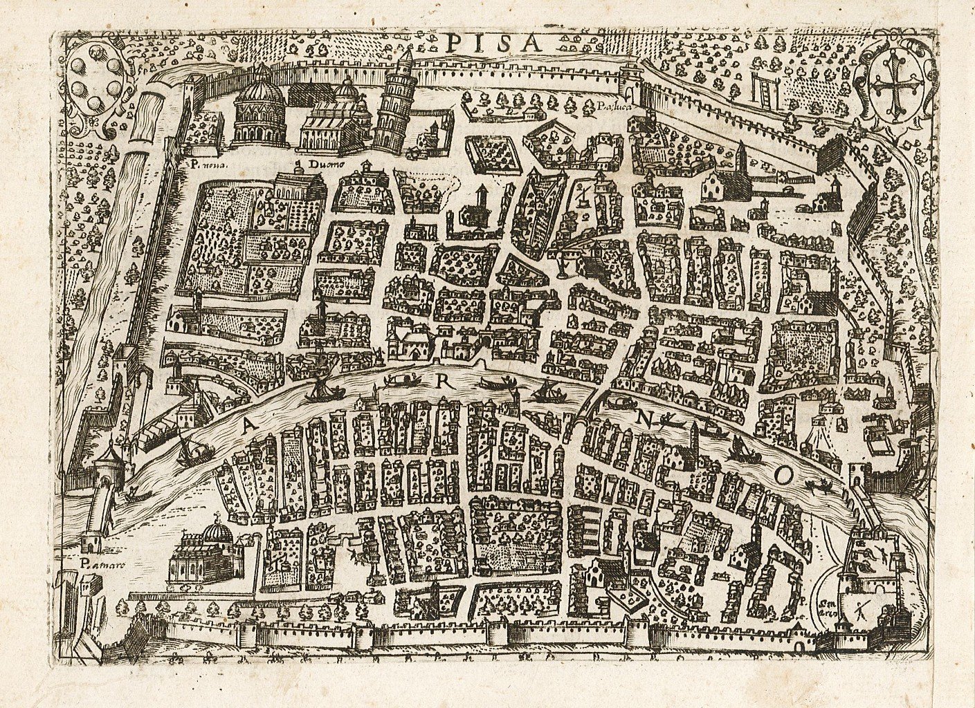 Stampa, antica ed originale, con pianta planimetrica prospettica della città. Autore: Bertelli Francesco. Luogo: Pisa. Anno: 1629. Tecnica: incisione in rame. Dimensioni: 125x174 mm. In allegato quattro pagine di testo descrittivo