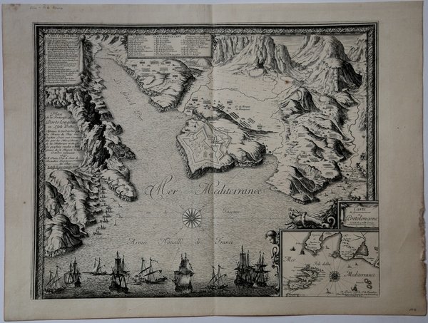 Rara pianta di Porto Azzurro, originariamente appellata Porto Longone, pubblicata nell'opera Les glorieuses conquestes de Louis le Grand roy de France et de Navarre. La pianta mostra l'assedio francese del 1646, durante la guerra franco-spagnola: la Francia inviò contro Porto Longone un'armata, al comando del duca di Meilleraye e del conte Du Plessis Praslin; 3000 uomini sbarcarono il 27 settembre nell'isola, e subito dopo la presa di Piombino Porto Longone fu attaccato dalle forze di terra e di mare. Non riuscendo utili i tiri delle artiglierie contro i robusti bastioni della fortezza, i Francesi, mediante lavori di scavo e di mina, riuscirono ad aprire una breccia nelle mura, per la quale mossero all'assalto. Dopo accanita resistenza, il 29 ottobre, gli Spagnoli si arresero. Nel riquadro in basso a destra, la cartina dell'intera isola d'Elba e la costa antistante con la città di Piombino. Sébastien Pontault de Beaulieu (1612-1674) fu un eminente ingegnere francese, che è considerato il primo topografo militare, o piuttosto l'inventore di quest'arte, durante il regno di Luigi XIV. Pontault entrò nell'esercito all'età di quindici anni, e si comportò con così tanto spirito all'assedio di La Rochelle, che il Re gli diede il posto di commissario di artiglieria, anche se era così giovane. In seguito, fu presente alla maggior parte delle battaglie e degli assedi, che ha descritto, e non lasciò la vita militare fino a quando la perdita di un braccio e altre ferite, con l'avvicinarsi della vecchiaia, resero necessario il ritiro. Pontault morì il 10 agosto 1674. Era pratica di Pontault seguire l'esercito e costruire sul posto i piani delle battaglie e degli assedi, con accompagnamento storico e prospettico. La sua opera più importante è intitolata Les glorieuses Conquêtes de Louis-le-Grand: ou Recueil, de Plans et Vues des places assiegeés, et de celles ou se_sont douneés des batailles, avec des Discours. Quest'opera è una delle più magnifiche del genere, copre tutte le operazioni di guerra, dalla battaglia di Rocroi, nel 1643, alla presa di Namur, nel 1692. Pontault morì nel 1674; ma l'opera fu completata fino a questa data a spese di sua nipote, la vedova Des Roches. Questa edizione è solitamente chiamata Grand Beaulieu, per distinguerla da una in scala ridotta, in quarto oblungo, chiamata Petit Beaulieu, di cui esistono due serie, una in tre volumi, con le vedute delle azioni nei Paesi Bassi; l'altra in quattro, che include quelle della Francia. Ogni copia contiene una diversa collezione di tavole; per una descrizione dettagliata delle copie BN e BL si veda M. Pastoreau. Le tavole furono poi utilizzate nella pubblicazione del Cabinet du Roi a partire dal 1727 e sono ora conservate al Louvre. Acquaforte su rame, impressa su carta vergata coeva, in ottime condizioni. Bibliografia Pastoreau, ' Les atlas français, Beaulieu XV; Shirley, ' Maps in the Atlases of the British Library ' T.BEAU-16a. Rare plan of Porto Longone, also known as Porto Azzurro, on the Island of Elba. Published in Les Glorieuses Conquestes de Louis le Grand - one of the most important works in the 17th century. Shows the bay and the surrounding area in great detail, with mountains, rivers, cliffs, and woods. The battle plan shows the forts, camps and tents, and sailing war ships. Two extensive keys explain the camp and the fortress. With a small inset map showing the entire island and the near Italian mainland coast with the city of Piombino. Sébastien Pontault de Beaulieu (1612–1674) was an eminent French engineer, who is considered to be the first military topographer, or rather the inventor of that art, during the reign of Louis XIV. Pontault went into the army at the age of fifteen, and behaved with so much spirit at the siege of Rochelle, that the king gave him the post of commissary of artillery, even though he was so young. He was afterwards present at most of the battles and siege, which he has described, and did not quit a military life until the loss of an arm and other wounds, with the approach of old age, rendered retirement necessary. Pontault died on 10 August 1674. From the death of this able drafts-man, there were few capable military topographers in France until the latter half of the 18th century. It was Pontault's practice to follow the army, and construct upon the spot plans of the battles and sieges, with historical and perspective accompaniments. His most important work is entitled Les glorieuses Conquêtes de Louis-le-Grand: ou Recueil, de Plans et Vues des places assiegeés, et de celles ou se_sont douneés des batailles, avec des Discours (The glorious victories of Louis the Great, produced from the drawings of the Chevalier de Beaulieu). This work is one of the most magnificent of the kind, covers all the operations of war, from the battle of Rocroi, in 1643, to the taking of Namur, in 1692. Pontault died in 1674; but the work was completed to the above date at the expense of his niece, the widow of the sieur Des Roches. This edition is usually called the Grand Beaulieu, to distinguish it from one on a reduced scale, in oblong quarto, called the Petit Beaulieu, of which there are two series, one in three volumes, with views of the actions in the Netherlands; the other in four, which includes those of France. Each copy contains a different collection of plates; for a detailed description of the BN and BL copies see Pastoreau. The plates were later used in the publication of the Cabinet du Roi from 1727 onwards and are now housed in the Louvre. Etching on copper, printed on contemporary laid paper, in very good condition. ' Literature Pastoreau, ' Les atlas français, Beaulieu XV; Shirley, ' Maps in the Atlases of the British Library ' T.BEAU-16a. Cfr.