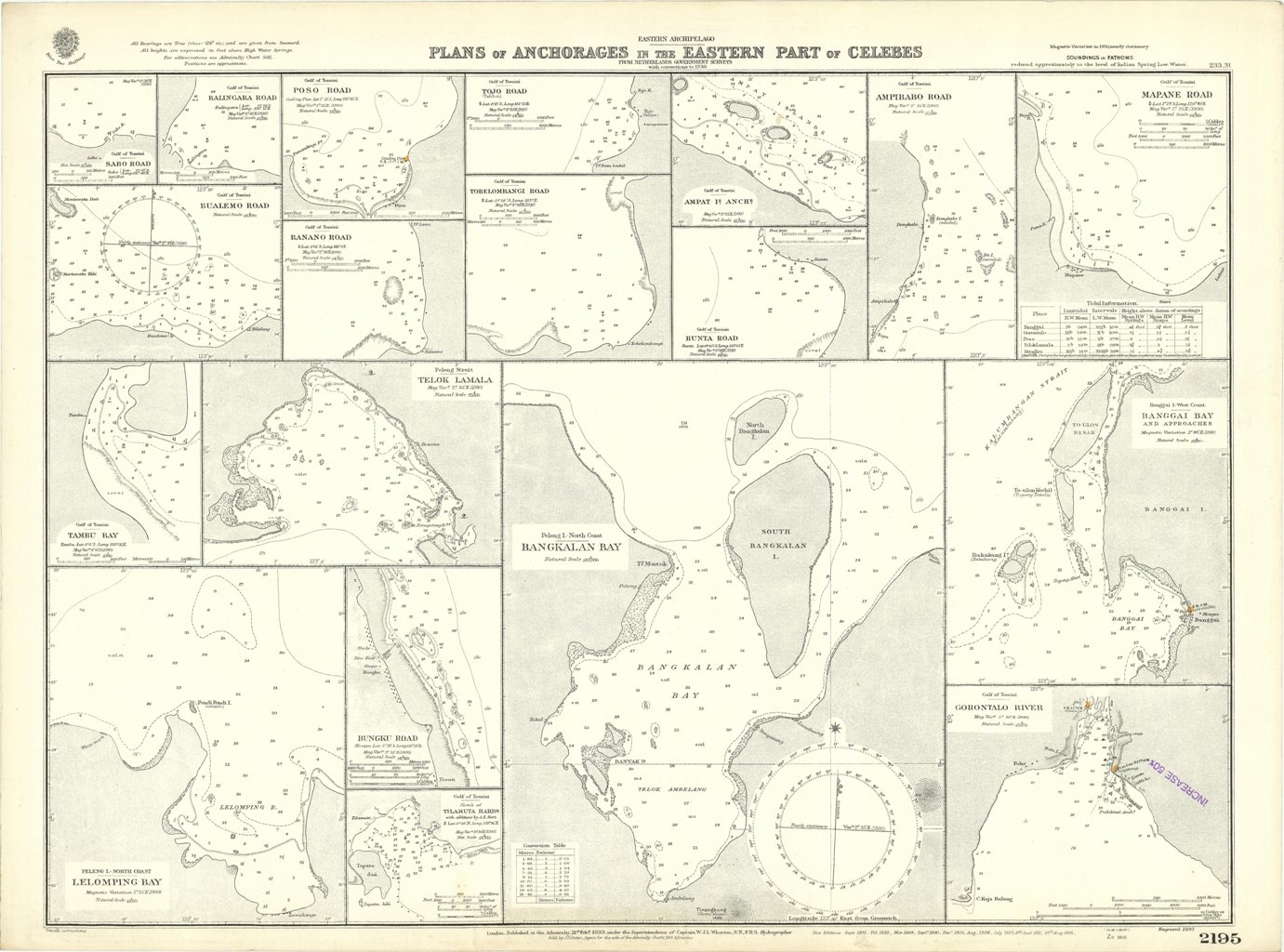 Plans of Anchorages in the Eastern part of Celebes From Netherlands Government surveys with corrections to 1930 - Magnetic Variation in 1930, nearly stationary. In the left side of the chart insert of Sabo Road, Balingara Road, Poso Road, Bualemo Road, Banano Road, Tambu Bay, Telok Lamala, Lelomping Bay, Bungku Road and Tilamuta Harb.r with additions by A.E. Hart. In the middle part insert of Tojo Road, Tobelombangi Road, Ampat I.s Anch. e, Bunta Road and Bangkalan Bay. In the right side insert of Ampibabo Road, Mapane Road, Banggai Bay and approaches, Gorontalo River. London Published at the Admiralty 21st Feb. 1893, under the Superintendence of Captain W.J.L. Wharton, Hydrographer. Small corrections. Autore: Admiralty Charts. Luogo: Indonesia - Celebes Sea. Anno: '900. Dimensioni: 464x646 mm