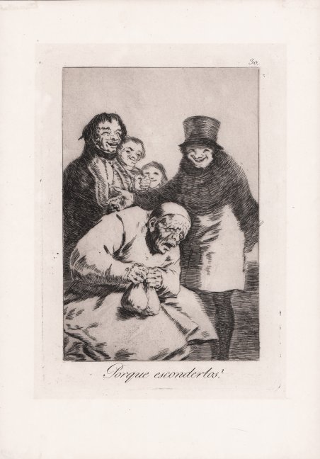 Opera tratta dai "Los Caprichos", per la prima volta pubblicati nel 1799. Prova della quarta edizione di dodici, stampata dalla calcografia di Madrid, circa 1870. Aquaforte, acquatinta brunita e puntasecca, in perfetto stato di conservazione. La serie chiamata Los Caprichos, è composta da ottanta incisioni, la cui prima edizione [l’unica a non essere pubblicata postuma] venne alla luce ne 1799. Curata in fase d’edizione dallo stesso artista, la serie fu commercializzata e dopo poco tempo ritirata dal mercato. Infatti, a causa dei numerosi soggetti che ironizzavano sulla società spagnola di fine secolo, il Goya subì una censura. L’interpretazione dei soggetti rappresentati su queste lastre, sempre enigmatiche, è spesso controversa. Etching with burnished aquatint and engraving, 1799. From the fourth edition of twelve of the so-called "Los Caprichos" series, edited by the Madrid Calcografia [circa 1870].A very good impression, with good contrast, printed on contemporary paper, customary margins, in very good conditions. The series called Los Caprichos, consists of eighty etchings. This first edition of 1799, the only one not to be published posthumously, is imprinted on soft laid pape. Cured in phase edition by the same artist, the series was marketed and before long withdrawn from the market. In fact, because of the many subjects that mocked the Spanish society of the century, Goya suffered censorship. The interpretation of the subjects represented on these plates, always enigmatic, is often controversial. Cfr. Harris 65