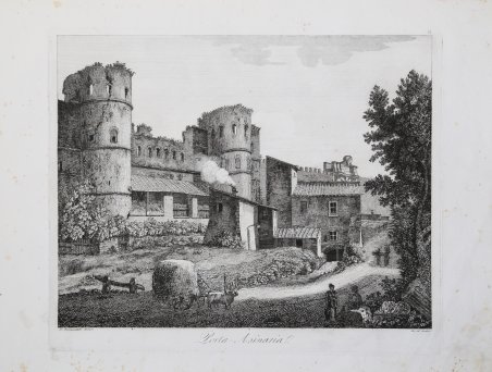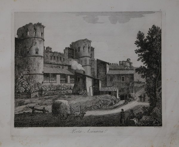 Bella e rara veduta di Porta Asinaria, nelle Mura Aureliane.Attraverso Porta Asinaria entrarono in Roma Belisario (536) e Totila (546) durante la guerra greco-gotica ed Enrico IV (1084) durante la lotta che lo contrappose a papa Gregorio VII. A seguito del progressivo innalzamento del livello del suolo circostante, la porta venne abbandonata e chiusa nel 1574 e sostituita dalla vicina Porta S. Giovanni che venne inaugurata l’anno seguente in occasione del Giubileo.Disegnata e incisa dall'architetto Luigi Ricciardelli, la tavola è la num. 11 della serie "Vedute delle porte e mura di Roma disegnate ed incise all acqua-forte dall'architetto Luigi Ricciardelli" edita a Roma nel 1832.L'opera, più che per l'effetto artistico, era apprezzata già dai contemporanei per il realismo dei disegni.Ecco come l'opera veniva presentata nel volume 74 della "Biblioteca italiana ossia giornale di letteratura scienze ed arti" del 1834:"Chi ha avuto sott'occhio le vedute di Roma disegnate ed incise dal Piranesi forse non potrà in queste gustare l'energia d effetto di quelle non già perchè non vi si Vegga ugualmente espresso il vero ma perchè mancano del più piccante effetto che quel celebre incisore dar sapeva.Ma ritornando alle porte di Roma incise dal sig architetto Ricciardelli avendole egli delineate sul luogo siamo certi che saranno le più fedeli al vero E ciò essendo importantissima cosa, avrà egli sotto di quest'aspetto un diritto di preferenza a quelle il cui maggior pregio consistesse nella bellezza dell intaglio e non nella precisione della cosa come ora trovasi"Acquaforte, lievi fioriture, nel complesso in ottimo stato di conservazione. Plate 11 from the series "Vedute delle porte e mura di Roma disegnate ed incise all acqua-forte dall'architetto Luigi Ricciardelli" , Rome, 1832.Copper etching, occasional foxing, otherwise in good condition. Cfr.