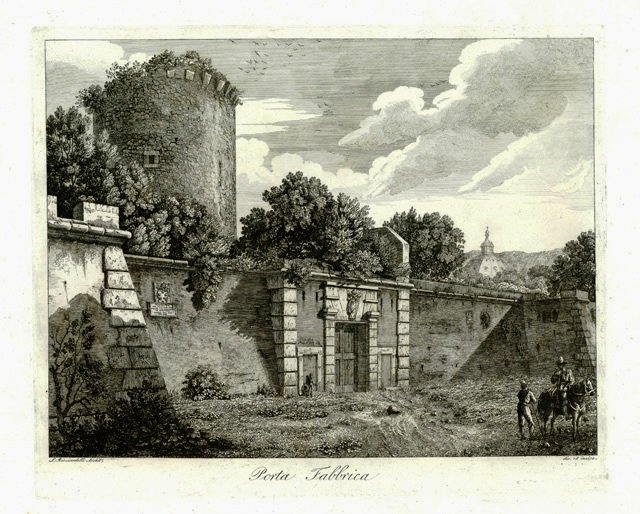Particolare veduta della porta Fabbrica, animata da viandanti e cavalieri