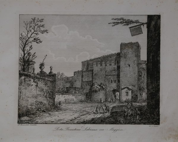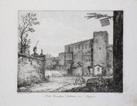 Disegnata e incisa dall'architetto Luigi Ricciardelli, la tavola è la num. 8 della serie "Vedute delle porte e mura di Roma disegnate ed incise all acqua-forte dall'architetto Luigi Ricciardelli" edita a Roma nel 1832.L'opera, più che per l'effetto artistico, era apprezzata già dai contemporanei per il realismo dei disegni.Ecco come l'opera veniva presentata nel volume 74 della "Biblioteca italiana ossia giornale di letteratura scienze ed arti" del 1834:"Chi ha avuto sott'occhio le vedute di Roma disegnate ed incise dal Piranesi forse non potrà in queste gustare l'energia d effetto di quelle non già perchè non vi si Vegga ugualmente espresso il vero ma perchè mancano del più piccante effetto che quel celebre incisore dar sapeva.Ma ritornando alle porte di Roma incise dal sig architetto Ricciardelli avendole egli delineate sul luogo siamo certi che saranno le più fedeli al vero E ciò essendo importantissima cosa, avrà egli sotto di quest'aspetto un diritto di preferenza a quelle il cui maggior pregio consistesse nella bellezza dell intaglio e non nella precisione della cosa come ora trovasi"Acquaforte, lievi fioriture, nel complesso in ottimo stato di conservazione. Plate 8 from the series "Vedute delle porte e mura di Roma disegnate ed incise all acqua-forte dall'architetto Luigi Ricciardelli" , Rome, 1832.Copper etching, occasional foxing, otherwise in good condition. Cfr.
