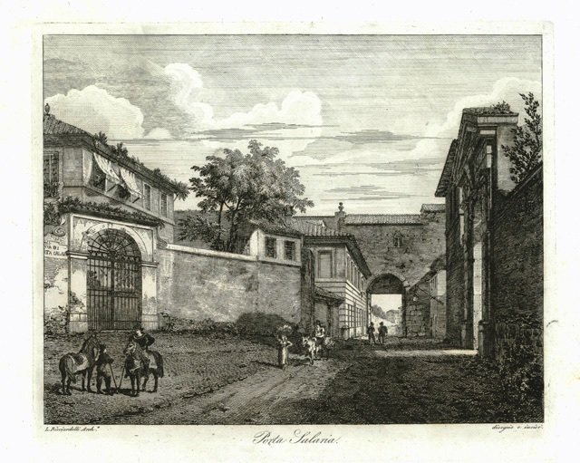 Particolare veduta di Porta Salaria, animata da viandanti e cavalieri