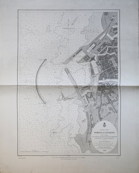 Carta nautica stampata dall’Istituto Idrografico della Marina. Aggiornata al 1881. La storia dell'Istituto Idrografico della Marina inizia pochi anni dopo l'unificazione nazionale con la creazione a Livorno, nel 1875, dell'Ufficio Centrale per il Servizio Scientifico della Regia Marina, dal quale avrebbero dovuto dipendere Uffici Dipartimentali eredi delle funzioni di elaborazione cartografica proprie delle istituzioni preunitarie. Fu invece creato il solo Ufficio Dipartimentale di Genova, presso il Forte San Giorgio, che a sua volta lasciò il posto, nel 1872, dall'ente cartografico nazionale denominato Ufficio Idrografico della Regia Marina. Nel 1899 tale denominazione fu trasformata in quella attuale di Istituto Idrografico della Marina. L'istituto fu fondato con regio decreto il 26 dicembre 1872 e alla sua guida fu chiamato il capitano di fregata, matematico e idrografo Giovan Battista Magnaghi, con il compito di eseguire il rilievo idrografico dei mari italiani e di produrre la documentazione nautica nazionale. Nel dopoguerra, oltre a ricognizioni per procedere all'aggiornamento delle carte nautiche, venne realizzata una nuova rete di triangolazione costiera. Incisione su zinco, con margini, in buono stato di conservazione. Bibliografia Amedeo Benedetti, L'Istituto Idrografico della Marina, in Charta Geographica, 93, ottobre 2007, pp. 12–13; Paola Presciuttini, L'Istituto Idrografico della Marina in Forte San Giorgio, Genova, I.I.M., 1995. The history of the Istituto Idrografico della Marina began a few years after the national unification with the creation in Livorno, in 1875, of the Ufficio Centrale per il Servizio Scientifico della Regia Marina, which should have depended on Departmental Offices heirs of the functions of cartographic processing of pre-unitary institutions. It was instead created only the Ufficio Dipartimentale di Genova, at Forte San Giorgio, which in turn left the place, in 1872, by the national mapping body called Ufficio Idrografico della Regia Marina. In 1899 this name was changed to the current name of Istituto Idrografico della Marina. ' The institute was founded by royal decree on 26 December 1872 and at its head was called the frigate captain, mathematician and hydrographer Giovan Battista Magnaghi, with the task of performing the hydrographic survey of the Italian seas and to produce the national nautical documentation. After the war, in addition to reconnaissance to update the nautical charts, a new coastal triangulation network was created. Engraving on zinc, with margins, in good condition. Bibliografia Amedeo Benedetti, L'Istituto Idrografico della Marina, in Charta Geographica, 93, ottobre 2007, pp. 12–13; Paola Presciuttini, L'Istituto Idrografico della Marina in Forte San Giorgio, Genova, I.I.M., 1995. Cfr.