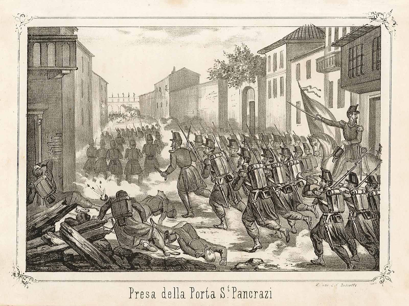 Raffigurazione della conquista di Porta S. Pancrazio, da parte dei Garibaldini