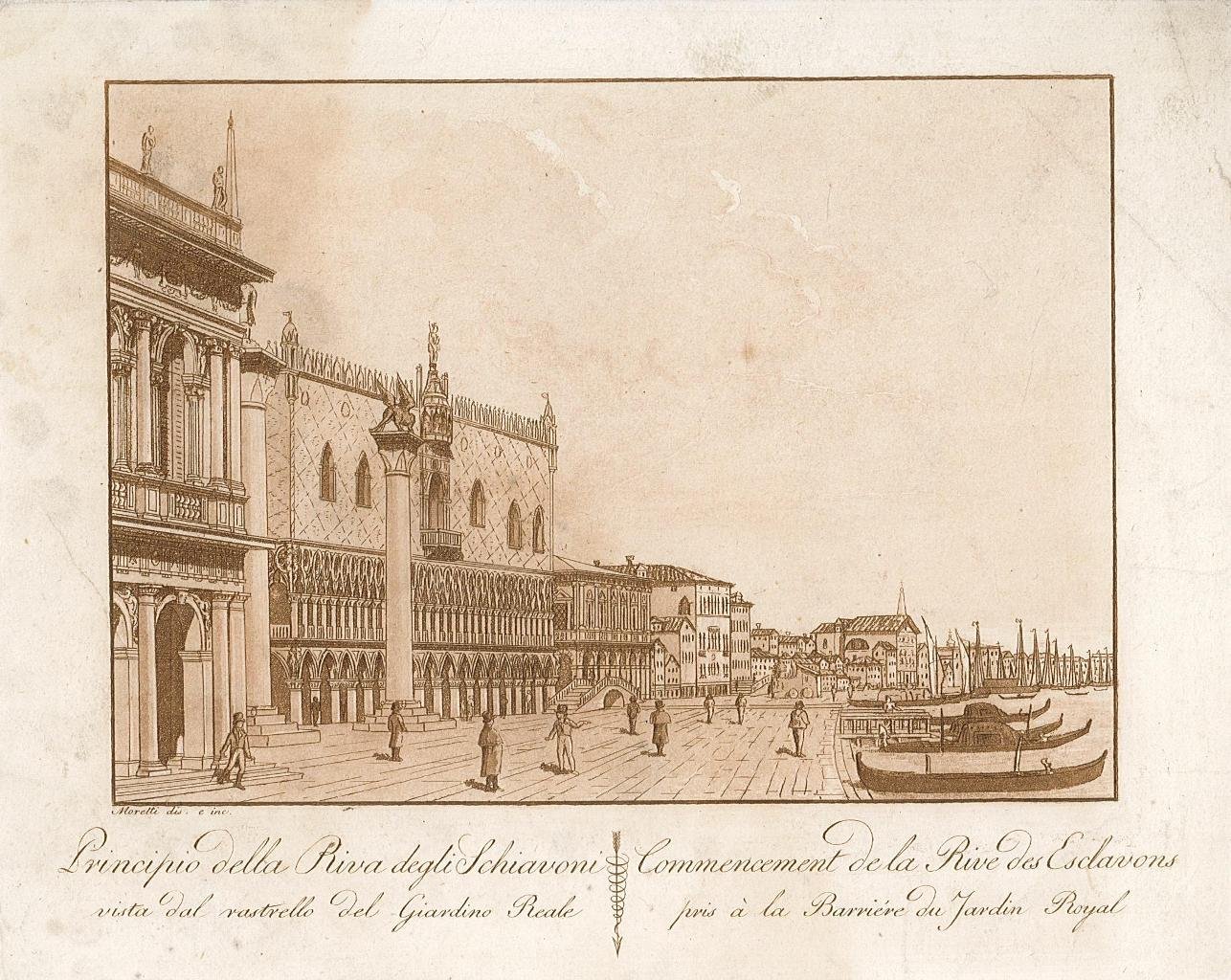 Principio della Riva degli Schiavoni vista dal rastrello del Giardino Reale - Il titolo si ripete in francese sulla destra