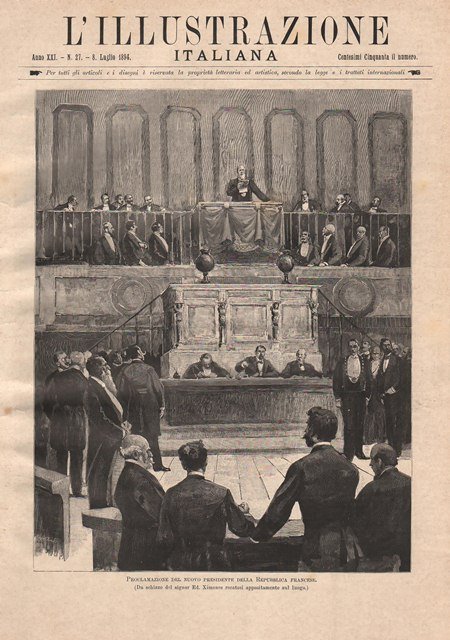 Veduta della proclamazione del nuovo Presidente della Repubblica Francese Jean Paul Pierre Casimir-Périer (Parigi 1847 - Parigi 1907), avvenuta il 27 giugno 1894 a Versailles. Testo al retro