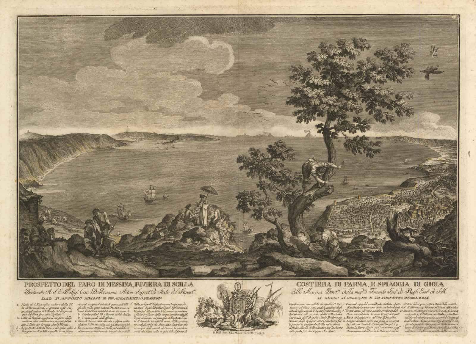 Ampia veduta del tratto di costa compreso tra le località di Scilla e Capo Vaticano in Calabria. In lontananza, sulla sinistra, si scorge la lanterna sul porto di Messina alle cui spalle si riconosce il profilo dell'Etna. Lungo la linea dell'orizzonte si notano i profili delle Isole Eolie. La scena è animata in primo piano dalla presenza di alcuni cacciatori, un pastore assopito ed un gruppetto di uomini. L'incisione è dedicata a Giovanni Acton, di cui al centro compare lo stemma araldico, il quale arrivò dal Gran Ducato di Toscana su richiesta della regina Maria Carolina di Napoli per riorganizzare la Marina dei Regni di Napoli e di Sicilia. Questi nell'anno di edizione della stampa venne promosso Tenente Generale e nominato Segretario di Stato della Marina. Ottimo lo stato di conservazione generale. Molto rara. Autore: Minasi Antonio dis. Luogo: Calabria - Sicilia. Anno: 1779. Tecnica: incisione in rame. Dimensioni: 374x625 mm