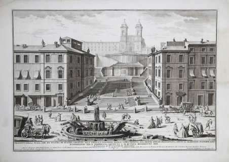 Veduta di Piazza di Spagna, incisa da Giuseppe Vasi su disegno di Francesco Panini. L'opera appartiene ad una serie di vedute di Roma stampate nella seconda metà del '700 per volere del Panini, che si avvalse della collaborazione dei migliori incisori ' dell’epoca: Vasi, Antonini, Barbazza, Cigni, Montagu, Polanzani e Volpato. Le tavole vengono stampate dalla Calcografia della Reverenda Camera Apostolica. Francesco Panini o Pannini (Roma 1738 - 10 aprile 1800) si formò con il padre Giovanni Paolo (Piacenza, 1691 - Roma, 1765) e ne proseguì l'attività vedutistica dedicandosi in modo particolare a realizzare raffinate opere su carta. In effetti, la scarsa attenzione critica a lui dedicata, tradisce la reale portata storica del pittore, che è da considerare tra i migliori interpreti della grafica settecentesca. La sua produzione, infatti, pur perpetuando una precisa tradizione riesce a esprimere un vero e proprio rinnovamento in chiave neoclassica. Dimostrandosi un abile prospettico, Panini fu elogiato dal Mariette e gli autori del 'Vignola illustrato' Giambattista Spampani e Carlo Antonini lo annoverano tra i pochi illustri prospettici e quale esempio per gli studiosi di architettura. Ma la produzione dell'artista conta altresì diverse imprese a fresco come la decorazione di Villa Albani, del piano nobile del Palazzo Cesarini Sforza e in Palazzo Doria, per conto del Cardinale Antonio Maria dipinse nel 1794 degli eleganti pannelli a grottesche. ' ' A lui si devono, con tutta probabilità, molte delle opere di collezioni pubbliche e private considerate della ‘scuola di Panini’ o ‘cerchia di Panini’ se non dello stesso Panini, e ciò pone un problema non piccolo per il catalogo dell’artista anche negli anni della maturità. Al contrario del padre Giovanni Paolo, uno dei più celebri e apprezzati pittori settecenteschi, Francesco Panini è stato oggetto di pochi studi. I dipinti e i disegni che oggi vengono riconosciuti alla sua mano mostrano vedute della Roma antica o di quella a lui contemporanea dove elaborate e grandiose architetture sono animate da piccole ed eleganti figure, proprio come nel foglio qui offerto. Una sua serie di acquarelli con Vedute di San Pietro è conservata presso il Dipartimento di Arti Grafiche del Louvre: tra queste è presente la stessa raffigurazione del prospetto principale della basilica vaticana se pur con un punto di vista più ravvicinato. L’attività indipendente di Francesco, pur sempre nel solco del genitore, riguardò soprattutto disegni con vedute romane per importanti incisori dell’epoca: Vasi, Antonini, Barbazza, Cigni, Montagu, Polanzani e Volpato. Acquaforte e bulino, stampata su carta vergata coeva, con margini, in ottimo stato di conservazione. Bibliografia L. Salerno, 'I pittori di vedute in Italia', Roma 1991, pp. 290-291; M. Celeste Cola, 'L'inventario di Francesco Pannini, dipinti, disegni e contorni nello studio di Palazzo Moroni', Pisa 2012, pp. 199-224. View of the Spanish Steps in Piazza di Spagna, engraved by Giuseppe Vasi after a drawing by Francesco Panini. The work belongs to a series of views of Rome printed in the second half of the 18th century at the behest of Panini, who availed himself of the collaboration of the best engravers of the time: Vasi, Antonini, Barbazza, Cigni, Montagu, Polanzani, Volpato and many others. The plates are printed by the Calcografia of Reverenda Camera Apostolica. Francesco Panini or Pannini (Rome 1738 - April 10, 1800) trained with his father Giovanni Paolo (Piacenza, 1691 - Rome, 1765) and continued the activity of vedutistica devoting himself in particular to the realization of refined works on paper. In fact, the scarce critical attention dedicated to him, betrays the real historical importance of the painter, who is to be considered among the best interpreters of eighteenth-century graphics. His production, in fact, while perpetuating a precise tradition manages to express a real renewal in a neoclassical key. Proving to be an able perspective artist, Panini was praised by Mariette and the authors of the 'Vignola illustrato' Giambattista Spampani and Carlo Antonini counted him among the few illustrious perspective artists and as an example for the scholars of architecture. But the production of the artist also counts several works in fresco as the decoration of Villa Albani, the main floor of the Palazzo Cesarini Sforza and Palazzo Doria, on behalf of Cardinal Antonio Maria painted in 1794 of the elegant grotesque panels. ' To him we owe, in all probability, many of the works in public and private collections considered to be of the 'school of Panini' or 'circle of Panini' if not of Panini himself, and this poses no small problem for the artist's catalog even in his mature years. Contrary to his father Giovanni Paolo, one of the most famous and appreciated 18th century painters, Francesco Panini has been the object of few studies. The paintings and drawings that today are attributed to his hand show views of ancient Rome or of that contemporary to him where elaborate and grandiose architectures are animated by small and elegant figures, just as in the sheet offered here. A series of his watercolors with views of St. Peter's is preserved in the Department of Graphic Arts of the Louvre: among them is the same depiction of the main facade of the Vatican basilica, albeit with a closer point of view. Etching and engraving, printed on contemporary laid paper, with margins, in excellent condition. Literature L. Salerno, 'I pittori di vedute in Italia', Rome 1991, pp. 290-291; M. Celeste Cola, 'L'inventario di Francesco Pannini, dipinti, disegni e contorni nello studio di Palazzo Moroni', Pisa 2012, pp. 199-224. Cfr. Scalabroni, 402