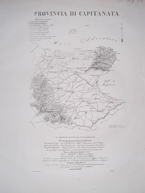 Carta geografica della Provincia di Capitanata priva di margine graduato. L'orografia è trattata a tratteggio mistoa luce zenitale. Sono indicati i confini di Provincia, Distretto, Circondario e sono esplicitati i territori confinati: Provincia di Molise, Provicnia di Principato Ultra, Basilicata e Provincia di Bari. Le strade sono suddivise in Regie Postali e Rotabili. In calce al centro sono riportate alcune notizie statistiche inerenti la suddivisione della Provincia, Dogane, Tribunali, Prodotti e Manifatture. La scala grafica è di "miglia 10 da 60 a grado". Una semplice freccia in campo libero, nell'angolo in alto a destra, indica il Nord per l'orientamento della carta. Ottimo lo stato di conservazione generale.