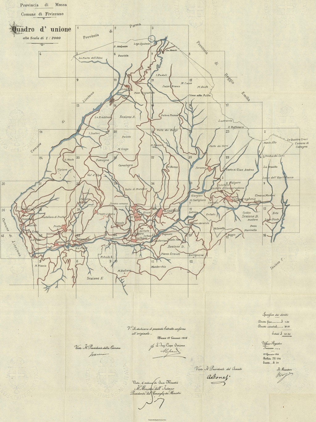Carta geografica del quadro d'unione del Comune di Fivizzano. Inserita nell'opera "Leggi e decreti del Regno d'Italia, dicitura riportata dalla filigrana. Pieghe editoriali