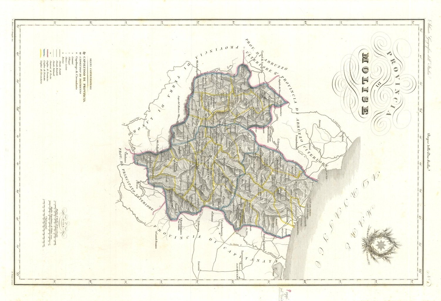 Carta geografica, antica ed originale, con rappresentazione della divisione territoriale della provincia di Campobasso con evidenziati i territori nei dintorni di Termoli, Larino, Guglionisi, Bonesco, Sant'Elia, Montagano, Castropignano, Frosolone, Carpinone, Cantalupo, Bojano, Sepino, Pontelandolfo. Inserita nel II volume dell'opera "Atlante Geografico degli Stati Italiani delineato sopra le migliori e più moderne mappe per servire di corredo alla Corografia Fisica Storica e Statistica dell'Italia" contenente le carte dell'Italia Inferiore. Descritta da Attilio Zuccagni-Orlandini, edita e stampata a Firenze nel 1844-45. Autore: Zuccagni - Orlandini edit. & G.Maina e V.Stanghi inc. Luogo: Molise. Anno: 1844. Tecnica: incisione in rame. Dimensioni: 520x336 mm. L'incisione è caratterizzata da una coloritura coeva ai confini