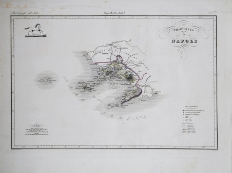 Carta geografica tratta dall’Atlante geografico degli Stati italiani delineato sopra le migliori e più moderne mappe per servire di corredo alla corografia fisica storica e statistica dell'Italia, di Attilio Zuccagni Orlandini stampato a Firenze, presso gli editori, 1844. In 2° massimo, 2 voll. Il primo volume contenente le carte dell’Italia Superiore in 52 fogli, il secondo volume quelle dell’Italia Inferiore in 77 fogli. Attilio Zuccagni Orlandini (1784-1872) nacque a Fiesole con il nome di Giuseppe Orlandini. In seguito all’adozione da parte del facoltoso zio materno Attilio Zuccagni (1754-1807), botanico e georgofilo, assunse il nome di Attilio Zuccagni Orlandini. La sua più importante opera è la relazione geografico-cartografica di tutti gli Stati preunitari italiani, la grandiosa Corografia fisica, storica e statistica dell’Italia e delle sue Isole (Firenze 1835-1845), in dodici volumi per diciannove tomi, con un volume introduttivo sull’intera penisola italiana. L’opera costituì la summa delle centinaia di opere geografiche generali, regionali e locali allora disponibili e presentava, per ogni Stato preunitario, la trattazione fisica, storica, topografica e un inquadramento statistico. Nel 1844-45, la Corografia fu arricchita con cinque volumi di cartografie, vedute e altre illustrazioni di luoghi e monumenti: Atlante geografico degli Stati italiani delineato sopra le migliori e più moderne mappe (due volumi con 144 tavole inclusa la grande carta della penisola in 15 fogli) e Atlante illustrativo ossia raccolta dei principali monumenti italiani antichi, del medio evo e moderni e di alcune vedute pittoriche (tre volumi con 413 illustrazioni, stampate su 269 fogli). Le tavole furono incise, sempre a Firenze, in due apposite officine, da quattro valenti artisti lombardi (Vittorio Angeli, Giacinto Maina, Pietro Manzoni e Giuseppe Pozzi). ' Soprattutto il primo dei due atlanti rappresenta, ancora oggi, una pietra miliare nella storia della cartografia e dell’iconografia geografica italiana. Fu veramente ‘un’ardua impresa’, dal momento che spesso mancavano ancora (come, ad esempio, per il Ducato di Lucca e lo Stato Pontificio) prodotti cartografici compiutamente geometrici. I due prodotti furono presentati ai Georgofili nel 1843 e nel 1844, insieme alla mappa della Repubblica di San Marino. L’opera si rivelò oltremodo costosa e non ottenne il successo commerciale sperato, ma servì da base per tante altre iniziative editoriali successive che vi attinsero, talora senza neppure rispettarne i diritti d’autore. Incisione in rame, coloritura coeva dei contorni, lievi ossidazioni, per il resto in ottimo stato di conservazione. ' Bibliografia Cfr. Anna Guarducci - Dizionario Biografico degli Italiani - Volume 100 (2020). Map taken from the Atlante geografico degli Stati italiani delineato sopra le migliori e più moderne mappe per servire di corredo alla corografia fisica storica e statistica dell'Italia, di Attilio Zuccagni Orlandini printed in Florence, 1844. The first volume contains the maps of Northern Italy in 52 sheets, the second volume those of Southern Italy in 77 sheets. Attilio Zuccagni Orlandini (1784-1872) was born in Fiesole under the name of Giuseppe Orlandini. Following adoption by his wealthy maternal uncle Attilio Zuccagni (1754-1807), a botanist and georgofile, he took the name Attilio Zuccagni Orlandini. His most important work is the geographic-cartographic report of all the pre-unification Italian states, the great Corografia fisica, storica e statistica dell'Italia e delle sue Isole (Florence 1835-1845), in twelve volumes for nineteen tomes, with an introductory volume on the entire Italian peninsula. The work constituted the sum of hundreds of general, regional and local geographic works then available and presented, for each pre-unification state, the physical, historical, topographical and statistical framework. In 1844-45, the Corografia was enriched with five volumes of maps, views and other illustrations of places and monuments: Atlante geografico degli Stati italiani delineato sopra le migliori e più moderne mappe (two volumes with 144 plates including the large map of the peninsula in 15 sheets) and Atlante illustrativo ossia raccolta dei principali monumenti italiani antichi, del medio evo e moderni e di alcune vedute pittoriche (three volumes with 413 illustrations, printed on 269 sheets). The plates were engraved, again in Florence, in two special workshops, by four talented Lombard artists (Vittorio Angeli, Giacinto Maina, Pietro Manzoni and Giuseppe Pozzi). ' Especially the first of the two atlases represents, even today, a milestone in the history of cartography and Italian geographic iconography. It was truly 'an arduous undertaking', since cartographic products were often still lacking (as, for example, for the Duchy of Lucca and the Papal States) fully geometric. The two products were presented to the Georgofili in 1843 and 1844, along with the map of the Republic of San Marino. The work proved to be very expensive and did not achieve the commercial success hoped for, but served as a basis for many other subsequent publishing initiatives that drew on it, sometimes without even respecting the copyright. ' Copperplate with fine outline colour, good condition. ' Literature Anna Guarducci - Dizionario Biografico degli Italiani - Volume 100 (2020). Cfr.
