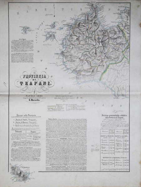 Carta tratta dal raro ' La Descrizione del Regno delle Due Sicilie, pubblicato per la prima volta nel 1854, rappresenta il necessario aggiornamento cartografico alla precedente opera dello stesso cartografo.Tuttavia in questo atlante viene data più importanza all’orografia, alle divisioni amministrative e alla rete stradale e ferroviaria.Le 24 carte che compongono l’opera, risultano pertanto come il più importante documento sulle regioni meridionali, appena prima dell’Unità d’Italia. Ben otto le carte raffiguranti la Sicilia, divisa nelle sette provincie. Benedetto Marzolla fu disegnatore topografo e litografo; geografo e cartografo; membro della Commissione di statistica presso il Ministero dell'Interno. Personaggio di grandissimo rilievo nella cartografia napoletana ed italiana del XIX secolo, Marzolla ottenne in vita pubblici riconoscimenti ed attestati per la produzione cartografica di altissima qualità. La sua notorietà si è lentamente dissolta dopo la morte; va tuttavia osservato che solo la mancanza di uno spiccato coinvolgimento politico in senso risorgimentale e di una valenza letteraria nella sua opera non lo hanno reso famoso come i contemporanei Francesco Costantino Marmocchi (1805-1858) e Attilio Zuccagni-Orlandini (1783-1872), con i quali può certamente confrontarsi. I progetti culturali didattici e editoriali di Marzolla furono e rimangono di straordinaria modernità; egli inventò, è il caso di dire, un nuovo modo di intendere e di disegnare la carta geografica, fornendo una visione assolutamente originale della comunicazione dei dati geografici attraverso la combinazione di testo e immagine. Con tale operazione, egli riuscì a fondere in un'unica opera, storia, geografia, economia, statistica e cartografia, raggiungendo un equilibrio grafico di rara efficacia (cfr. V. Valerio, ' Benedetto Marzolla Brindisino, Geografo e Cartografo dell'800 Europeo, Brindisi 2008). Litografia, coloritura coeva dei contorni, in ottimo stato di conservazione.Bibliografia Valerio, ' Benedetto Marzolla. Brindisino, Geografo e Cartografo dell’800 Europeo, n. 117; Tooley,s Dictionary, p. 216. The ' Descrizione del Regno delle Due Sicilie, first published in 1854, is a cartographic update to the previous production of the cartographer himself.Nonetheless, even more important in the atlas are orography, administrative division and read and train network.The 24 maps that form the collection are therefore the most important document on Southern regions, right before Italy was unified. Eight maps depict Sicily, divided in seven provinces. Benedetto Marzolla was draftsman topographer and lithographer, geographer and cartographer. Character of great importance in the Neapolitan and Italian cartography of the nineteenth century, Marzolla obtained during his life public recognition and certificates for the production of high quality cartography. His notoriety slowly faded after his death; it should be noted, however, that only the lack of a strong political involvement in the sense of the Risorgimento and of a literary value in his work did not make him as famous as his contemporaries Francesco Costantino Marmocchi (1805-1858) and Attilio Zuccagni-Orlandini (1783-1872), with whom he can certainly compare himself. Marzolla's cultural, didactic and editorial projects were, and remain, extraordinarily modern; he invented a new way of understanding and drawing maps, providing an absolutely original vision of the communication of geographical data through the combination of text and image. With this operation, he was able to merge in a single work, history, geography, economics, statistics and cartography, achieving a graphic balance of rare effectiveness. Litograph with original outline colour, very good condition.Bibliografia Valerio, Benedetto Marzolla. Brindisino, Geografo e Cartografo dell’800 Europeo, n. 117; Tooley,s Dictionary, p. 216. Cfr.