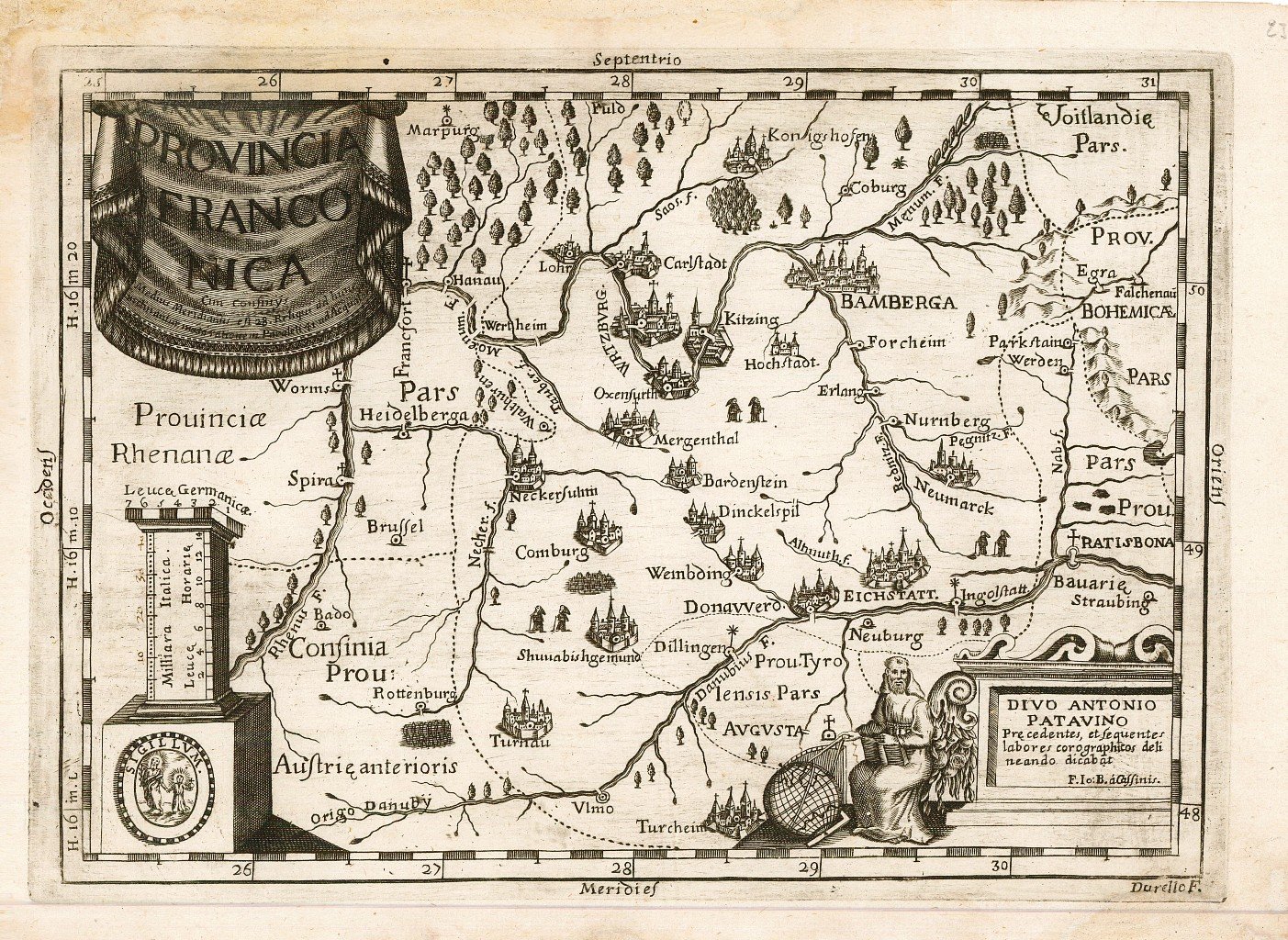 Carta geografica raffigurante l'antica Provincia di Franconica in Germania. Sono indicate le città principali, quali: Bamberga, Wurzburg, Norimberga etc. La carta è corredata da relativa Dichiarazione in cui sono riportati alcuni dati, quali: numero degli Arcivescovadi, dei Vescovadi, delle Università, degli Ospizi, indicazione dei confini etc. Per questa edizione della "Chorographica descriptio provinciarum et conventuum.S. Francisci Capucinorum.", curata dal ministro provinciale di Milano Giovanni Battista da Cassine, su espressa richiesta del Ministro Generale Agostino da Latisana, le tavole furono nuovamente incise con un disegno generale e coordinate geografiche del tutto differenti dalle precedenti edizioni. Gli incisori delle carte di questa edizione sono da individuarsi nelle figure di Simone Durello ed il Padre Cappuccino Michelangelo de Dinant.
