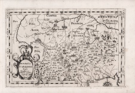 Carta geografica tratta dalla “Chorographica Descriptio Provinciarum et Conventum.”, atlante dell'ordine dei frati cappucini. Si tratta della nuova edizione dell'atlante delle province cappuccine, iniziato in forma manoscritta dal ministro generale dell'ordine, padre Silvestro da Panicale nel 1632, e che doveva servire da sussidio geografico per le visite generali. Alla sua morte il successore Padre Giovanni di Montecaliero, al quale spesso viene erroneamente attribuita la paternità delle carte, incaricò padre Massimino da Guechen di proseguire l'opera, edita per la prima volta a Roma nel 1643.A commissionare a Giovanni Battista da Cassine la Chorographica descriptio Provinciarum, et Conventuum FF. Min. S. Francisci Capucinorum fu Agostino da Latisana, 34° Ministro Generale dei cappuccini dal 1702 fino al 1709. Nell'estate di nove anni dopo, l'attento lavoro di rettifica ed aggiornamento era concluso e, retrodatando l'atlante al 1712, lo si poté stampare nel 1713 a Milano.L'opera conta 62 carte geografiche incise in rame. Vi sono raffigurate un'Europa, tra le poche mappe che rechi una data -il 1710- essendoci il 1711 per le altre datate, la Spagna con 7 carte, la Francia con 13, l'Italia con 26 carte geografiche, l'Impero con 15 fogli.L'opera mostrava visivamente la diffusione dell'ordine, infatti le diverse carte dell'atlante, che rappresentano nazioni e province, offrono per ognuna di esse la statistica completa dei conventi. Questa edizione definitiva del 1712 presenta le carte totalmente differenti, aggiornate ed arricchite. Incisione in rame, in ottimo stato di conservazione. Carta geografica tratta dalla “Chorographica Descriptio Provinciarum et Conventum.”, atlante dell'ordine dei frati cappucini. Si tratta della nuova edizione dell'atlante delle province cappuccine, iniziato in forma manoscritta dal ministro generale dell'ordine, padre Silvestro da Panicale nel 1632, e che doveva servire da sussidio geografico per le visite generali. Alla sua morte il successore Padre Giovanni di Montecaliero, al quale spesso viene erroneamente attribuita la paternità delle carte, incaricò padre Massimino da Guechen di proseguire l'opera, edita per la prima volta a Roma nel 1643.A commissionare a Giovanni Battista da Cassine la Chorographica descriptio Provinciarum, et Conventuum FF. Min. S. Francisci Capucinorum fu Agostino da Latisana, 34° Ministro Generale dei cappuccini dal 1702 fino al 1709. Nell'estate di nove anni dopo, l'attento lavoro di rettifica ed aggiornamento era concluso e, retrodatando l'atlante al 1712, lo si poté stampare nel 1713 a Milano.L'opera conta 62 carte geografiche incise in rame. Vi sono raffigurate un'Europa, tra le poche mappe che rechi una data -il 1710- essendoci il 1711 per le altre datate, la Spagna con 7 carte, la Francia con 13, l'Italia con 26 carte geografiche, l'Impero con 15 fogli.L'opera mostrava visivamente la diffusione dell'ordine, infatti le diverse carte dell'atlante, che rappresentano nazioni e province, offrono per ognuna di esse la statistica completa dei conventi. Questa edizione definitiva del 1712 presenta le carte totalmente differenti, aggiornate ed arricchite. Incisione in rame, in ottimo stato di conservazione. Cfr.