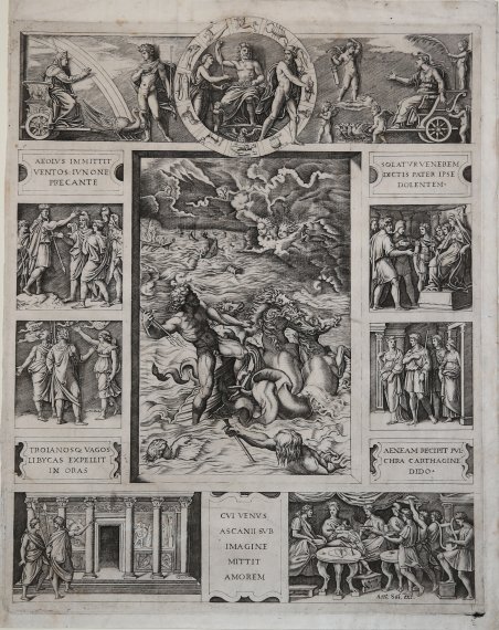 Bulino, circa 1516. Da un soggetto di Raffaello. Esemplare del secondo stato di tre con l’indirizzo del Salamanca. Bellissima prova, impressa su carta vergata coeva con filigrana “scudo con stella e lettera M”, con sottili margini, piccoli strappi restaurati nei margini, per il resto in ottimo stato di conservazione.La composizione illustra alcuni episodi tratti dal primo libro dell’Eneide. Derivata dalla celebre Tabula Iliaca Capitolina, ne rappresenta una contemporanea traduzione a stampa, espressamente richiesta da Raffaello a Raimondi, e da quest’ultimo eseguita, con ogni probabilità, nello stesso anno. Le scene, chiuse entro pannelli, sono riprodotte alla maniera dei rilievi antichi mentre il grande campo nel mezzo è concepito alla maniera di un quadro. La scena principale descrive le flotte troiane in balia di una tempesta, con Enea che alza le braccia al cielo in gesto implorante. In primo piano Nettuno, a cavallo della quadriga, placa le onde del mare pronunciando minaccioso le celebri parole “Quos ego!”. “[…]it ' presents subjects from Book One of the Aeneid, particularly those that take place after the escape of Aeneas and his men from Troy and before their departure from Carthage. The central scene of ' Quos Ego, and its eponymous subject, is that moment at the beginning of ' the poem when Neptune commandingly calms a storm in order to procure Aeneas’s passage to the shores of North Africa. The surrounding scenes represent the circumstances and the deeds that follow thereupon. On the upper left, we see Juno ordering Aeolus, god of the winds, to wreak havoc on the Trojan ships. In the central roundel, Venus implores the enthroned Jupiter to help her son, Aeneas, and the Trojans, with Mercury departing ' to deliver Jupiter’s help. On the upper right, Venus sends Cupid to lend additional support to Aeneas. On the left frame flanking ' the Neptune scene, we see Aeneas consoling the men who have survived the storm, Aeneas’s conversation with his mother, and, at the bottom left, ' Aeneas and Achates admiring paintings ' of the Trojan War on the walls of Juno’s temple in Carthage. In the small spaces to the ' right of the Neptune scene we see the Trojans in Dido’s throne room, then Dido leading Aeneas to a banquet, and at the bottom right, Dido, Aeneas, and Cupid, here dis-guised as Ascanius, dining together. It is during this feast that Dido falls in love with Aeneas by means of the wiles of Cupid, thus setting the stage for their tragic rupture. […] Quos Ego is only one in a group of prints by Raphael and Marcantonio ' that ' present ' episodes ' from ' the Aeneid, ' some of ' which are among the most famous in the Raphael–Marcantonio œuvre. […] Of course, the striking artificiality of the frame is further emphasized by Raphael’s adoption of all’antica style for its scenes and inscriptions. The scenes of the frame, after all, are portrayed according to the model of Antonine relief sculpture that Raphael was studying at this time in Rome. In the spirit of his precocious art historical researches, Raphael does not project his figurations into anything like believable, perspectivally correct settings, but rather places them, in the manner of Roman reliefs, among disproportionately small props standing for doorways and buildings. […] Yet, Raphael’s most brilliant all’antica gesture was to organize the whole print in accord with the example of the tabula iliaca, a type of classical stone carving that depicted Homeric and Virgilian episodes in compartments around a larger scene. By organizing his scenes according to this framework, Raphael not only emulated antique artistic example, but also took advantage of a structural homology between the sculptural tabula and the theoretical ideal of the window-like image. In this way, Raphael lent classical weight to a contemporary concept of painting, underlining that what we see through it looks like an actual view into profound depth: Neptune’s s. Engraving, about 1516. After Raphael. Example of the second state of three, showing the address of Antonio Salamanca. A very good impression, printed on contemporary laid paper with watermark "shield with star an letter M", with margins, some small tears repaired at the margins, otherwise in excellent condition. Ambitious in terms of the subject matter and the complex compositional conception in the style of classical relief sculptures, this print is considered among the most important ones of Marcantonio Raimondi’s prolific career and one of his most accomplished examples of “ancient engraving”. In fact, the composition of the scenes is inspired by a relief dating to the first century A.D. known as the Tabula iliaca, a tablet illustrating scenes from the Iliad and the Odyssey in a series of small narrative panels arranged around a central scene. “[…]it ' presents subjects from Book One of the Aeneid, particularly those that take place after the escape of Aeneas and his men from Troy and before their departure from Carthage. The central scene of ' Quos Ego, and its eponymous subject, is that moment at the beginning of ' the poem when Neptune commandingly calms a storm in order to procure Aeneas’s passage to the shores of North Africa. The surrounding scenes represent the circumstances and the deeds that follow thereupon. On the upper left, we see Juno ordering Aeolus, god of the winds, to wreak havoc on the Trojan ships. In the central roundel, Venus implores the enthroned Jupiter to help her son, Aeneas, and the Trojans, with Mercury departing ' to deliver Jupiter’s help. On the upper right, Venus sends Cupid to lend additional support to Aeneas. On the left frame flanking ' the Neptune scene, we see Aeneas consoling the men who have survived the storm, Aeneas’s conversation with his mother, and, at the bottom left, ' Aeneas and Achates admiring paintings ' of the Trojan War on the walls of Juno’s temple in Carthage. In the small space