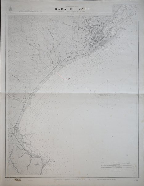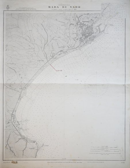 Carta nautica stampata dall’Istituto Idrografico della Marina. Aggiornata al 1931. La storia dell'Istituto Idrografico della Marina inizia pochi anni dopo l'unificazione nazionale con la creazione a Livorno, nel 1875, dell'Ufficio Centrale per il Servizio Scientifico della Regia Marina, dal quale avrebbero dovuto dipendere Uffici Dipartimentali eredi delle funzioni di elaborazione cartografica proprie delle istituzioni preunitarie. Fu invece creato il solo Ufficio Dipartimentale di Genova, presso il Forte San Giorgio, che a sua volta lasciò il posto, nel 1872, dall'ente cartografico nazionale denominato Ufficio Idrografico della Regia Marina. Nel 1899 tale denominazione fu trasformata in quella attuale di Istituto Idrografico della Marina. L'istituto fu fondato con regio decreto il 26 dicembre 1872 e alla sua guida fu chiamato il capitano di fregata, matematico e idrografo Giovan Battista Magnaghi, con il compito di eseguire il rilievo idrografico dei mari italiani e di produrre la documentazione nautica nazionale. Nel dopoguerra, oltre a ricognizioni per procedere all'aggiornamento delle carte nautiche, venne realizzata una nuova rete di triangolazione costiera. Incisione su zinco, con margini, in buono stato di conservazione. Bibliografia Amedeo Benedetti, L'Istituto Idrografico della Marina, in Charta Geographica, 93, ottobre 2007, pp. 12–13; Paola Presciuttini, L'Istituto Idrografico della Marina in Forte San Giorgio, Genova, I.I.M., 1995. The history of the Istituto Idrografico della Marina began a few years after the national unification with the creation in Livorno, in 1875, of the Ufficio Centrale per il Servizio Scientifico della Regia Marina, which should have depended on Departmental Offices heirs of the functions of cartographic processing of pre-unitary institutions. It was instead created only the Ufficio Dipartimentale di Genova, at Forte San Giorgio, which in turn left the place, in 1872, by the national mapping body called Ufficio Idrografico della Regia Marina. In 1899 this name was changed to the current name of Istituto Idrografico della Marina. The institute was founded by royal decree on 26 December 1872 and at its head was called the frigate captain, mathematician and hydrographer Giovan Battista Magnaghi, with the task of performing the hydrographic survey of the Italian seas and to produce the national nautical documentation. After the war, in addition to reconnaissance to update the nautical charts, a new coastal triangulation network was created. Engraving on zinc, with margins, in good condition. Bibliografia Amedeo Benedetti, L'Istituto Idrografico della Marina, in Charta Geographica, 93, ottobre 2007, pp. 12–13; Paola Presciuttini, L'Istituto Idrografico della Marina in Forte San Giorgio, Genova, I.I.M., 1995. Cfr.